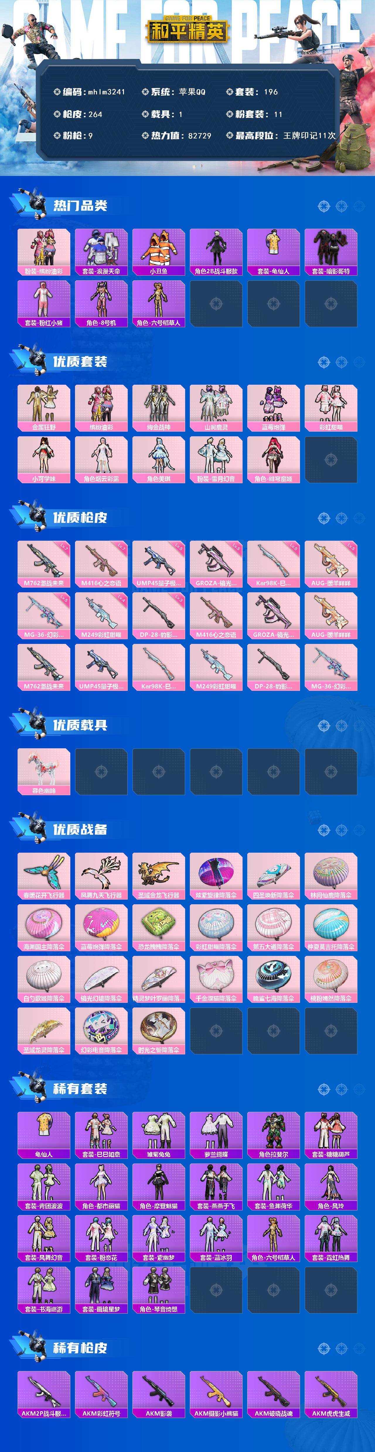 【mhlm3241】苹果 手Q-11粉装-9特效枪-1载具-4粉色飞行器-82729热力值-11王牌印记-196套装-264枪皮