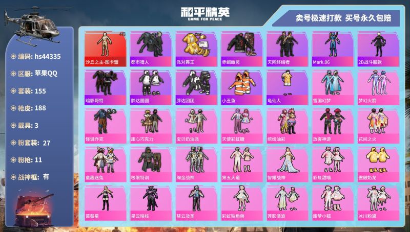 【6822】36粉装-18特效枪-6载具-179079热力值-19印记-312套装-422枪皮【红色神装等级】:一级魔童闹海-哪吒,五级精灵之光-露米娜,一级梦海之灵-妮芮妲【红色角色神装】:魔童闹海-哪吒,精灵之光-露米娜,梦海之灵-妮芮妲【热门品类】:都市猎人【粉色套装】:梦幻火箭【粉色枪皮等级】:九级P90-仙履奇缘