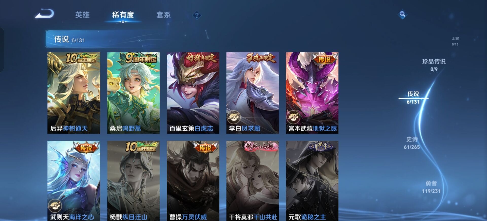 【稀有英雄】敖隐(小龙人),大司命,嬴政(始皇帝),韩信(韩跳跳),夏洛特(夏师傅),艾琳,橘右京(橘子),娜可露露(鸟人),不知火舞,赵云,金蝉(唐僧),戈娅