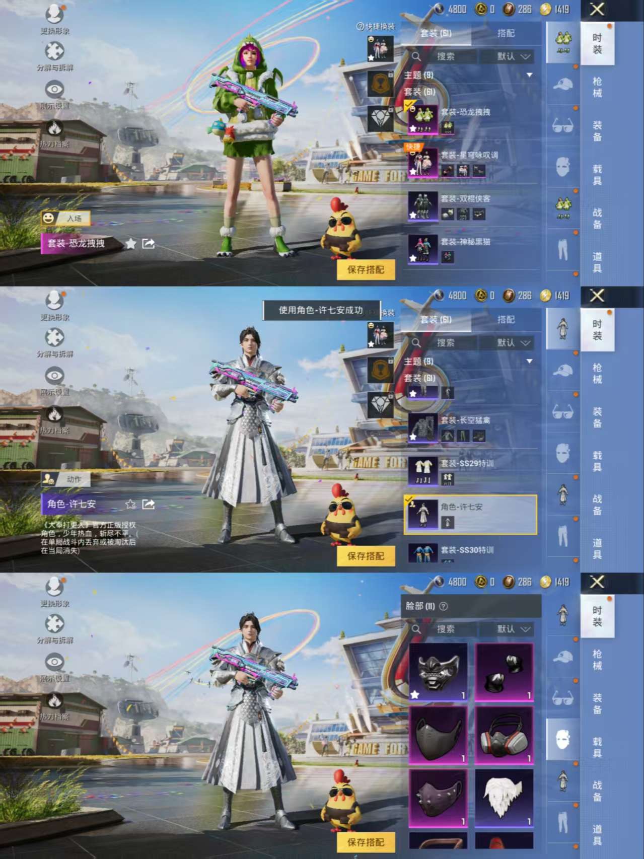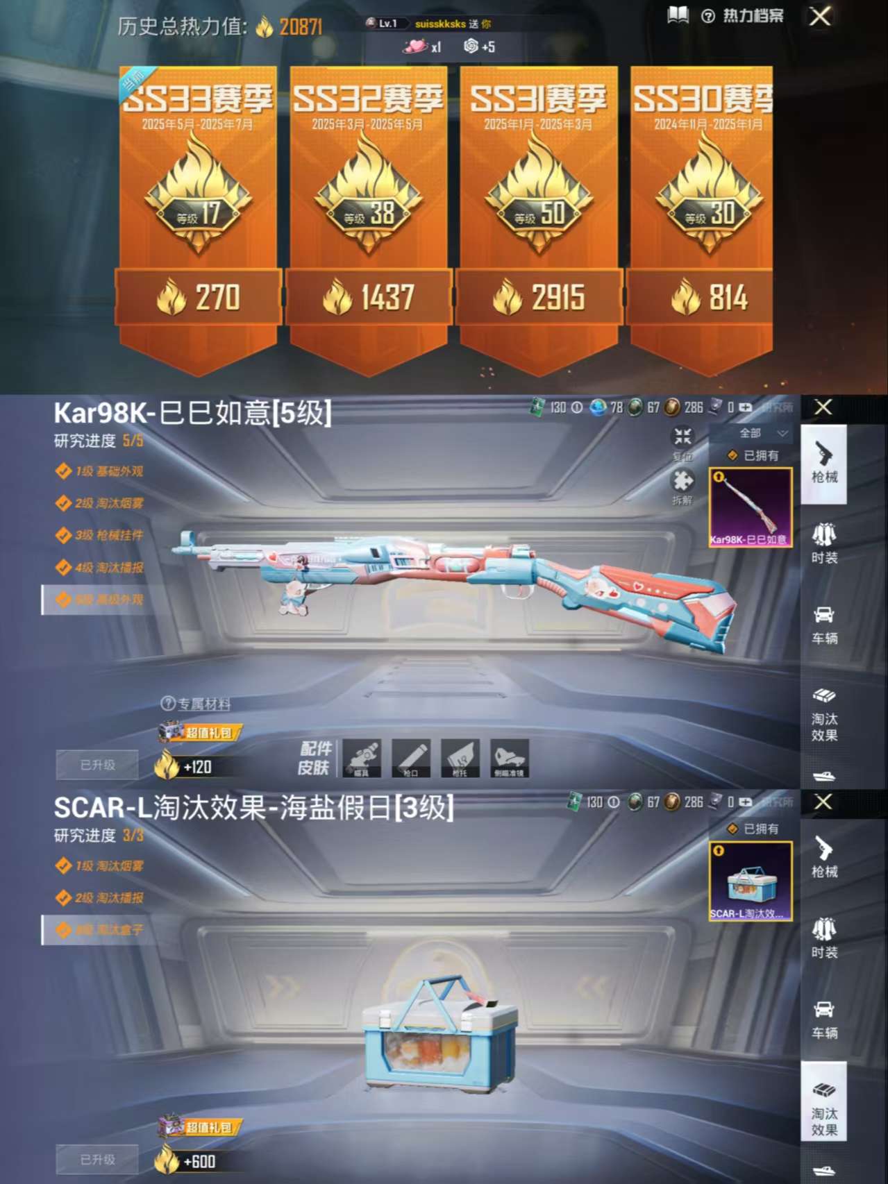 -2粉装-1特效枪-20601热力值-59套装-65枪皮【优质套装】:星穹咏叹调 恐龙拽拽【特效枪等级】:Kar98K-巳巳如意(五级- Kar98K-巳巳如意)【优质武器皮肤】: Kar98K-巳巳如意【稀有武器皮肤】: DBS-乌木金纹 SCAR-L-海盐豹豹 K