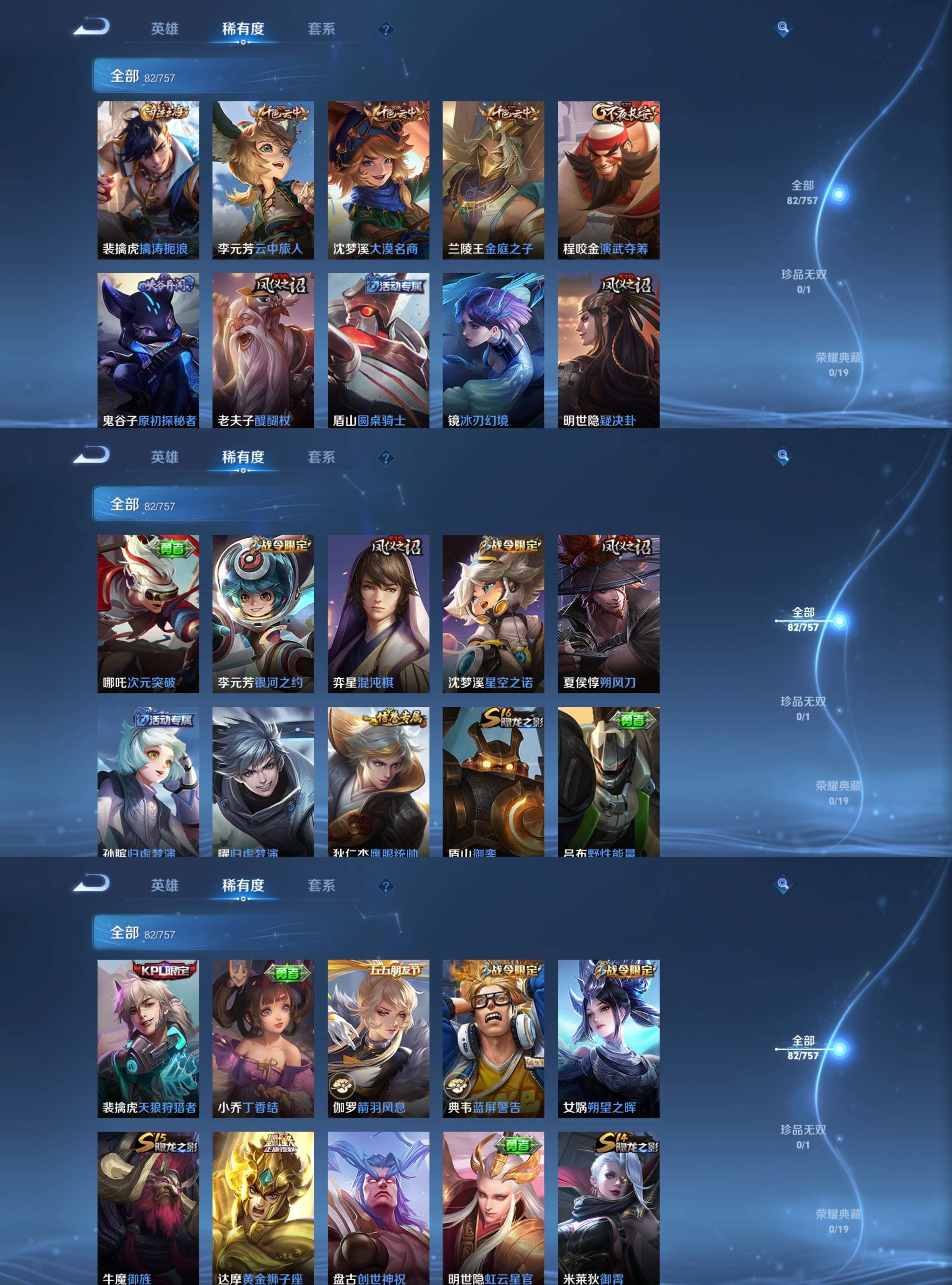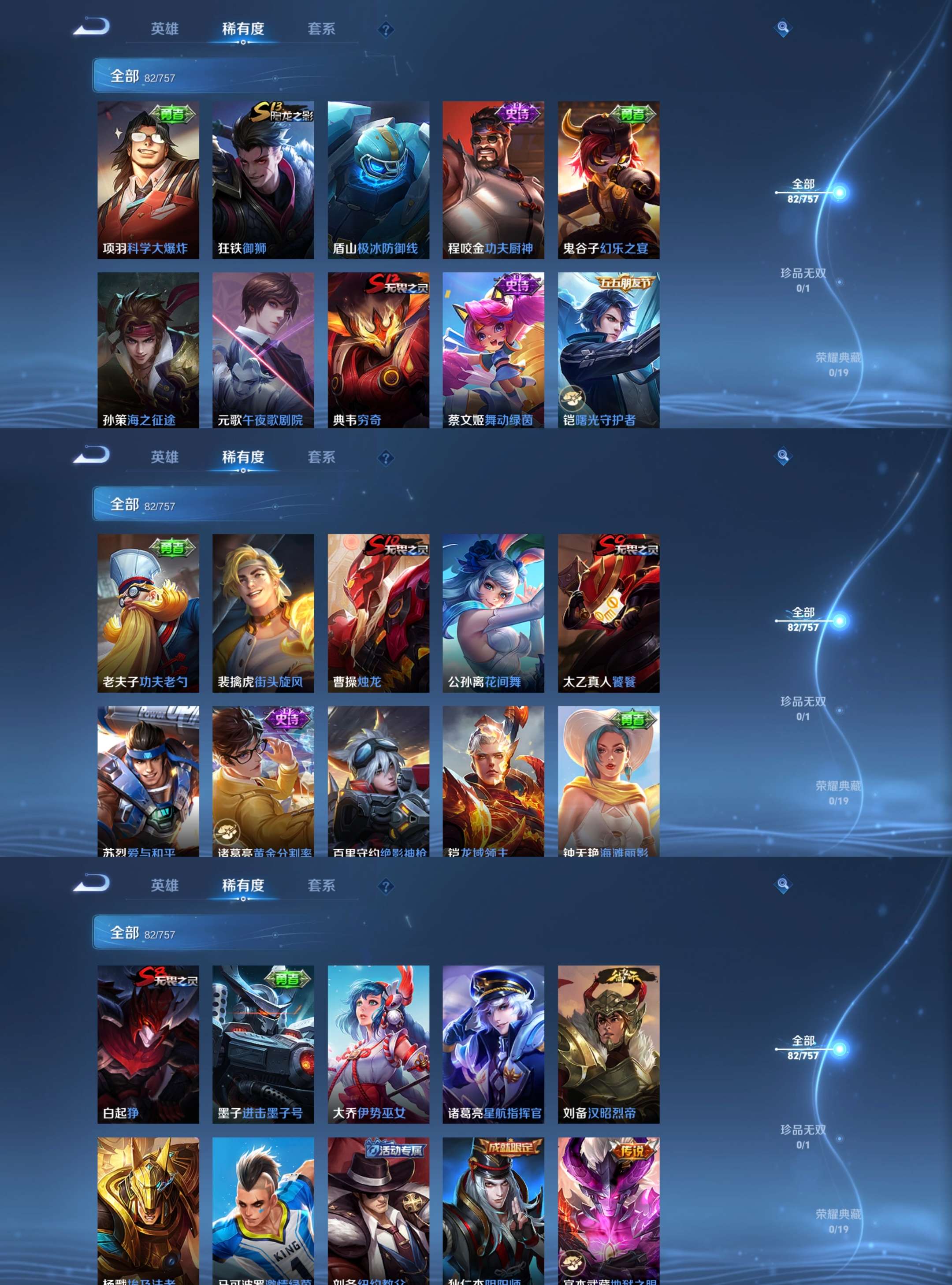 【史诗皮肤】 银河之约 魅力维加斯 黄金分割率 舞动绿茵 鹰眼统帅 魔术师 皇家上将 功夫厨神 圣诞狂欢 曙光守护者 箭羽风息 蓝屏警告 天狼狩猎者 水果甜心 【勇者皮肤】 圆桌骑士 烛龙 爱心护理 大漠名商 纽约教父 丁香