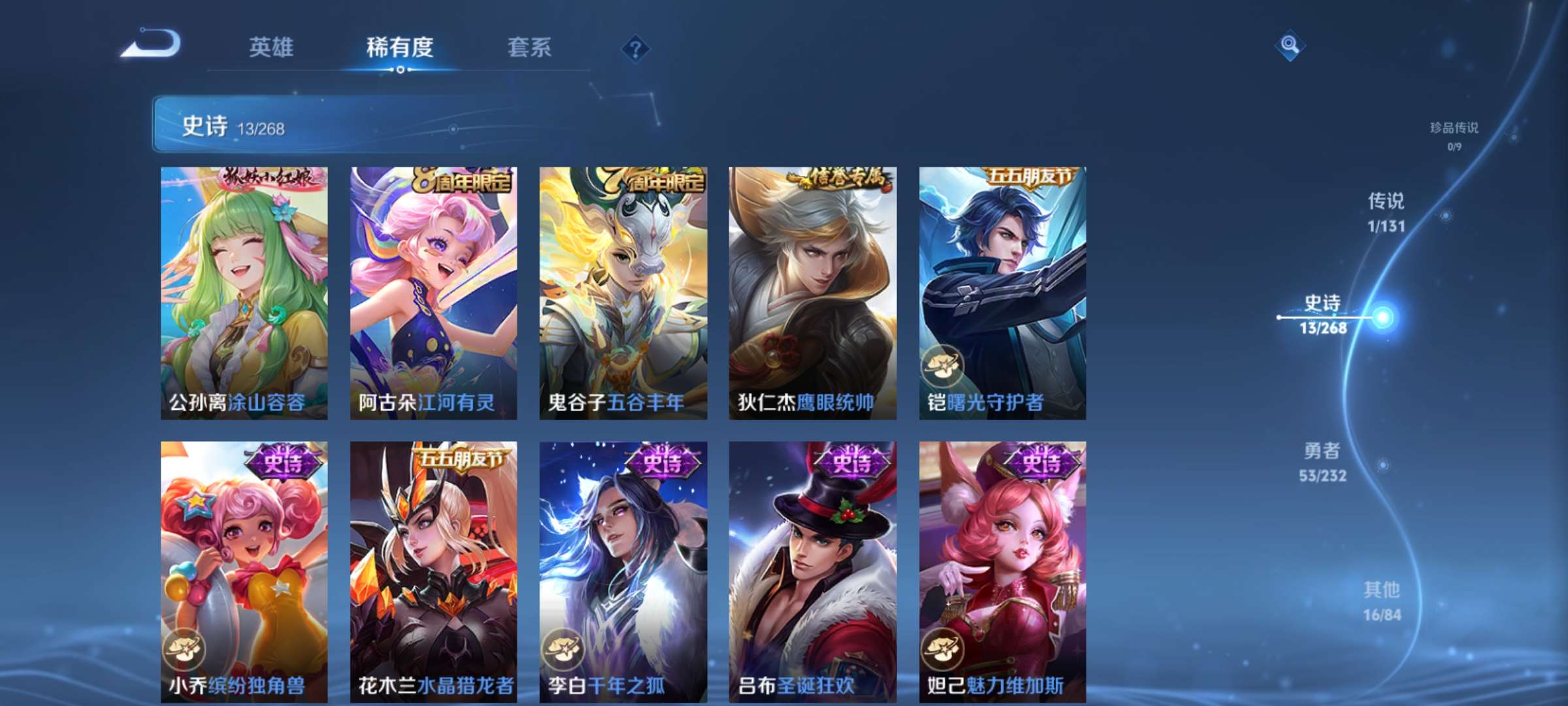【史诗皮肤】 五谷丰年 鬼剑武藏 魅力维加斯 鹰眼统帅 水晶猎龙者 圣诞狂欢 地狱岩魂 千年之狐 曙光守护者 缤纷独角兽 水果甜心 江河有灵
