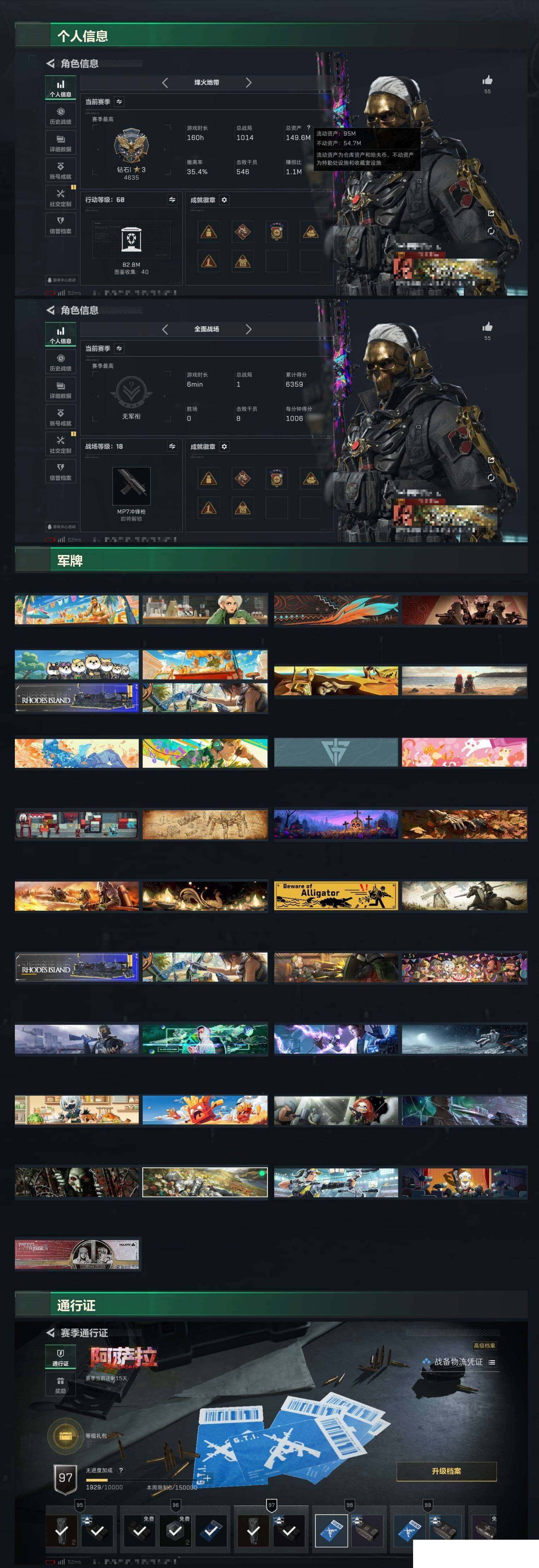 149m+等级60+北极星+蚀金玫瑰+赛季3*3+训练7靶场4仓库7 烽火地带段位: 钻石 全面战场段位: 列兵 总资产: 149000000 哈夫币: 679000