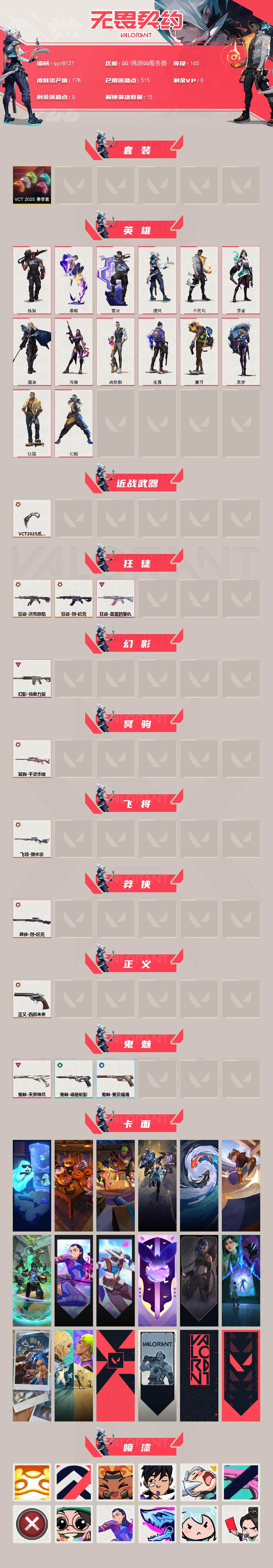 【qyz8121】创·纪元 莽侠 塑水宗 飞将 天界神兵 鬼魅 千灵华绽 冥驹 西部未来 正义 洪荒怒焰 狂徒 盖亚的复仇 狂徒 侦察力量 幻影 VCT 2025 爪刀 创·纪元 狂徒 qyz8121 套装: VCT 2025赛季礼包 近战武器皮肤: VCT 2025 爪刀 步枪皮肤: 狂徒-盖亚的复仇,幻影-侦察力量,狂徒-洪荒怒焰,狂徒-创·纪元 佩枪皮肤: 鬼魅-天界神兵,正义-西部未来 狙击枪皮肤: 飞将-塑水宗,冥驹-千灵华绽,莽侠-创·纪元 亮点: 【qyz8121】