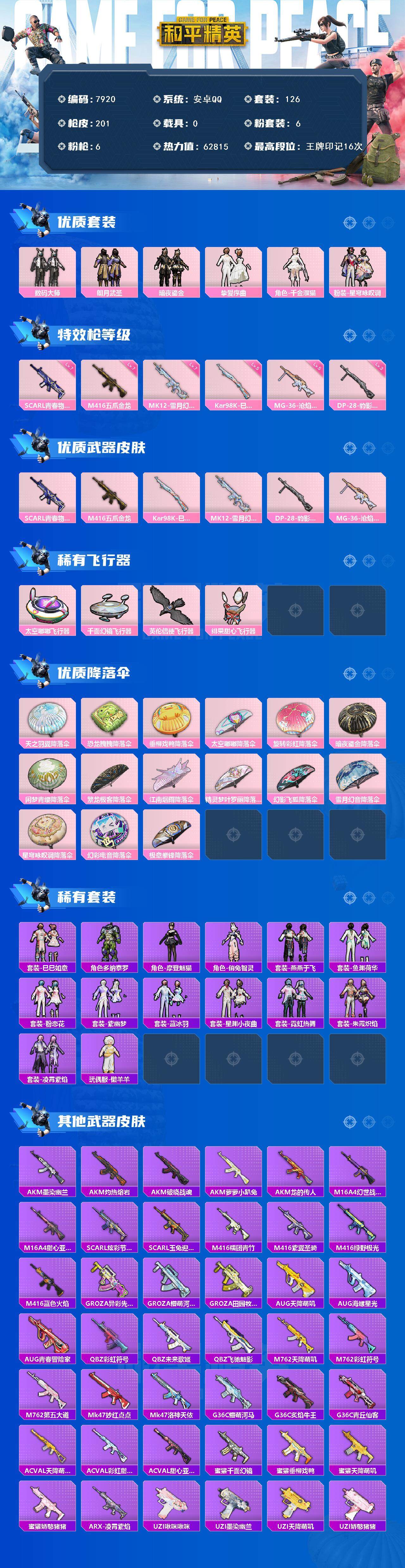 【7920】-6粉装-6特效枪-0载具-5粉色飞行器-62795热力值-16王牌印记-126套装-201枪皮