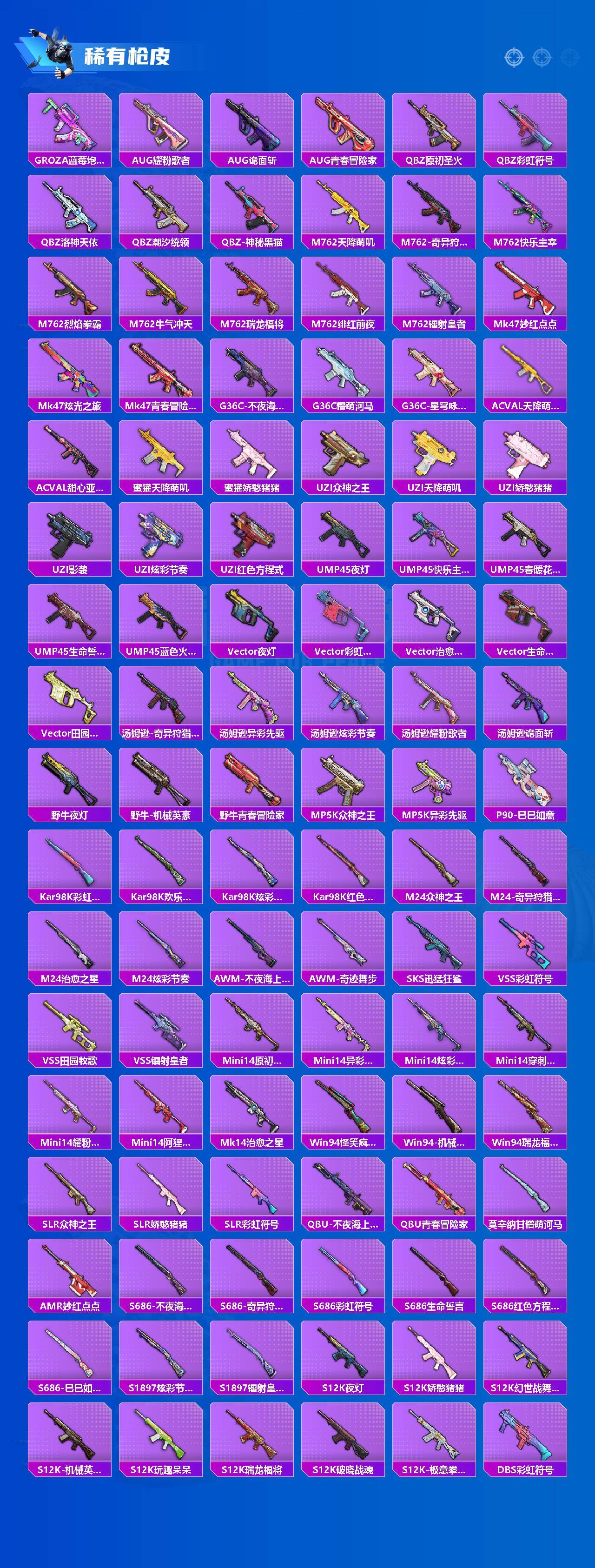 【粉色枪皮等级】:M416-电玩时刻(五级),AUG-暖羊咩咩(五级),Kar98K-巳巳如意(五级),DP-28-豹影