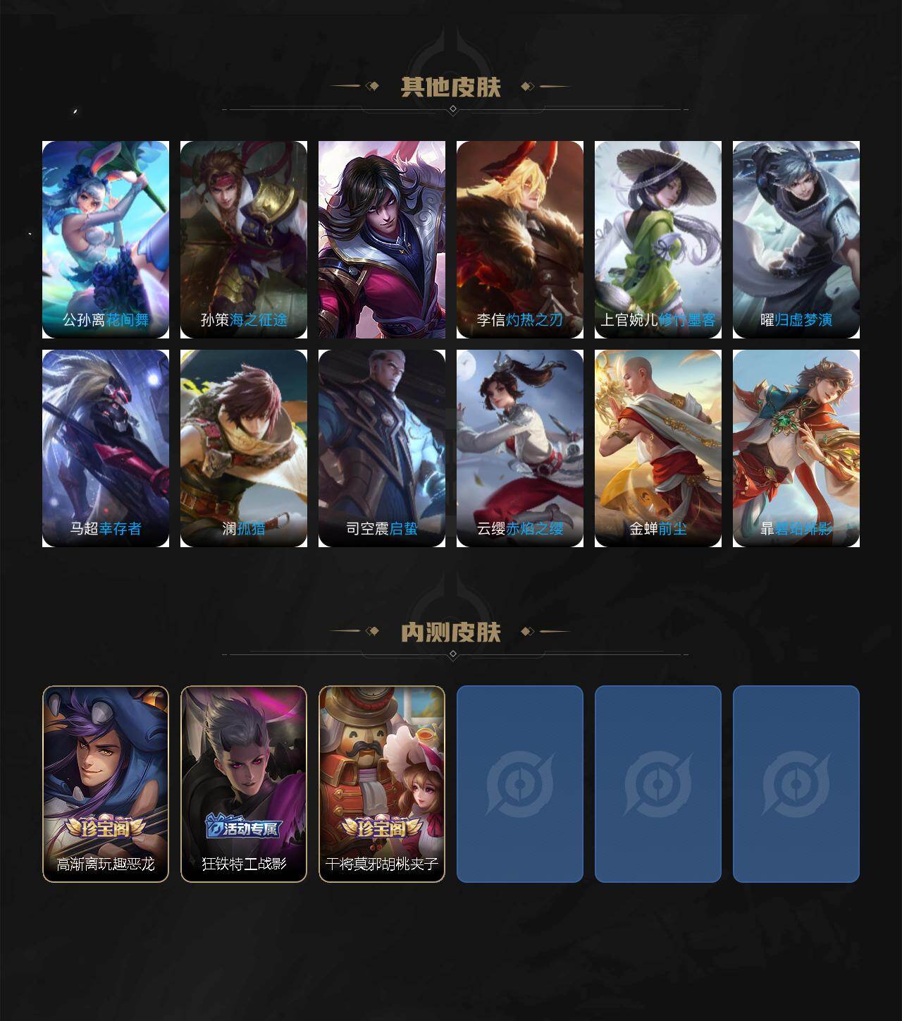 【传说皮肤】:后羿神树通天,女娲愿照千秋盛,澜愿照九州拓,虞姬愿照岁时盈,桑启鸣野蒿,李白诗剑行,百里守约碎云,曜李逍遥 ,曜云鹰飞将,貂蝉猫影幻舞,达摩黄金狮子座,后羿黄金射手座,宫本武藏地狱之眼,孙悟空地狱火