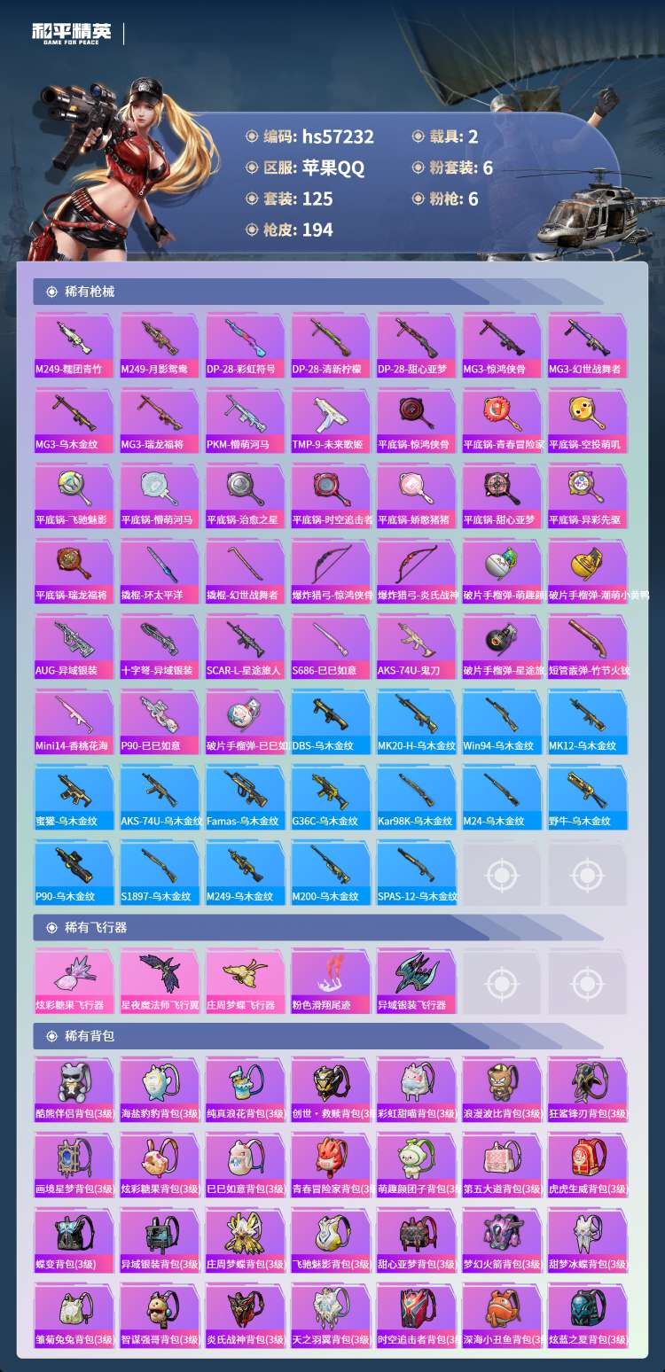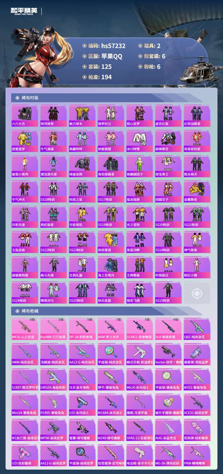 hs57232苹果手Q-15王牌印记-6粉装-6特效枪-2载具-65025热力值-125套装-194