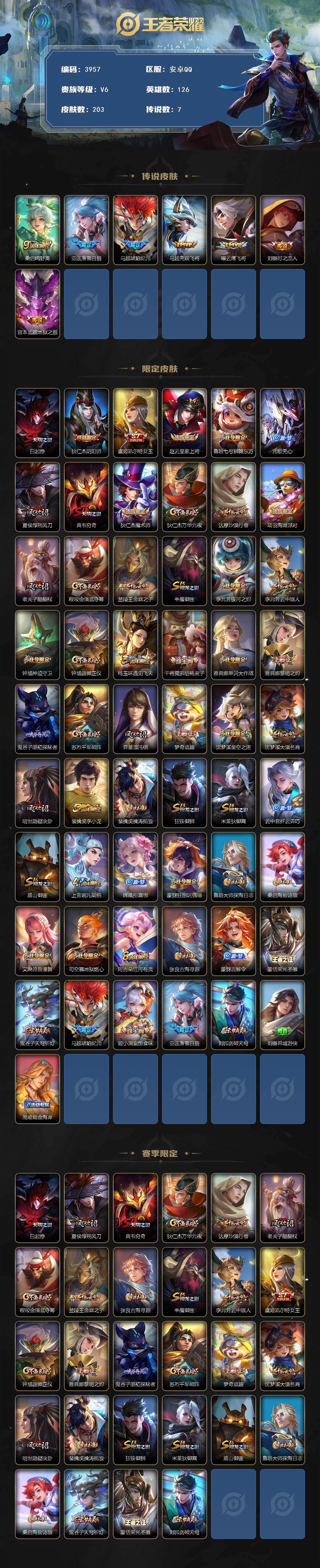 安卓Q-V6-尊贵铂金III段位-126英雄-203皮肤-7传说-47史诗