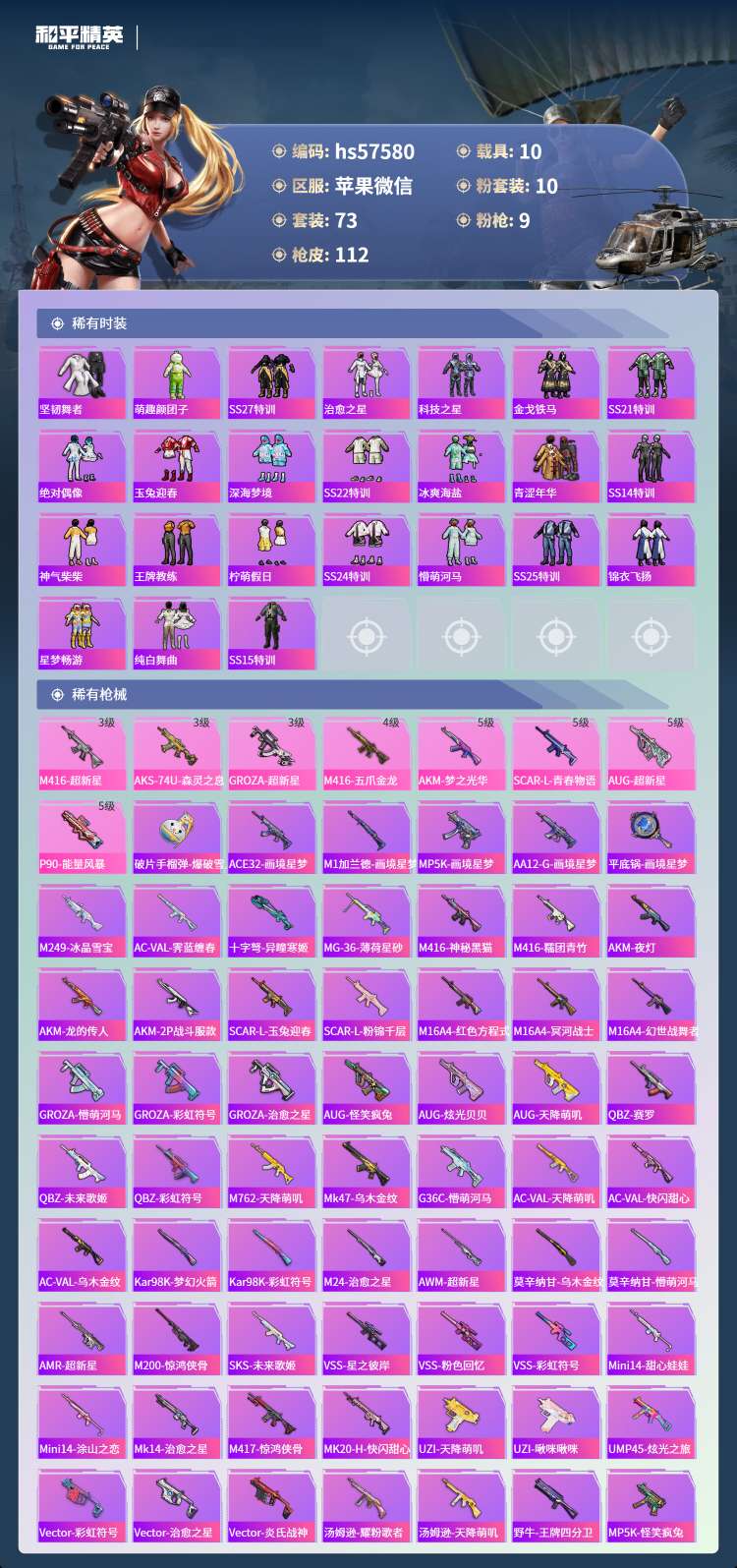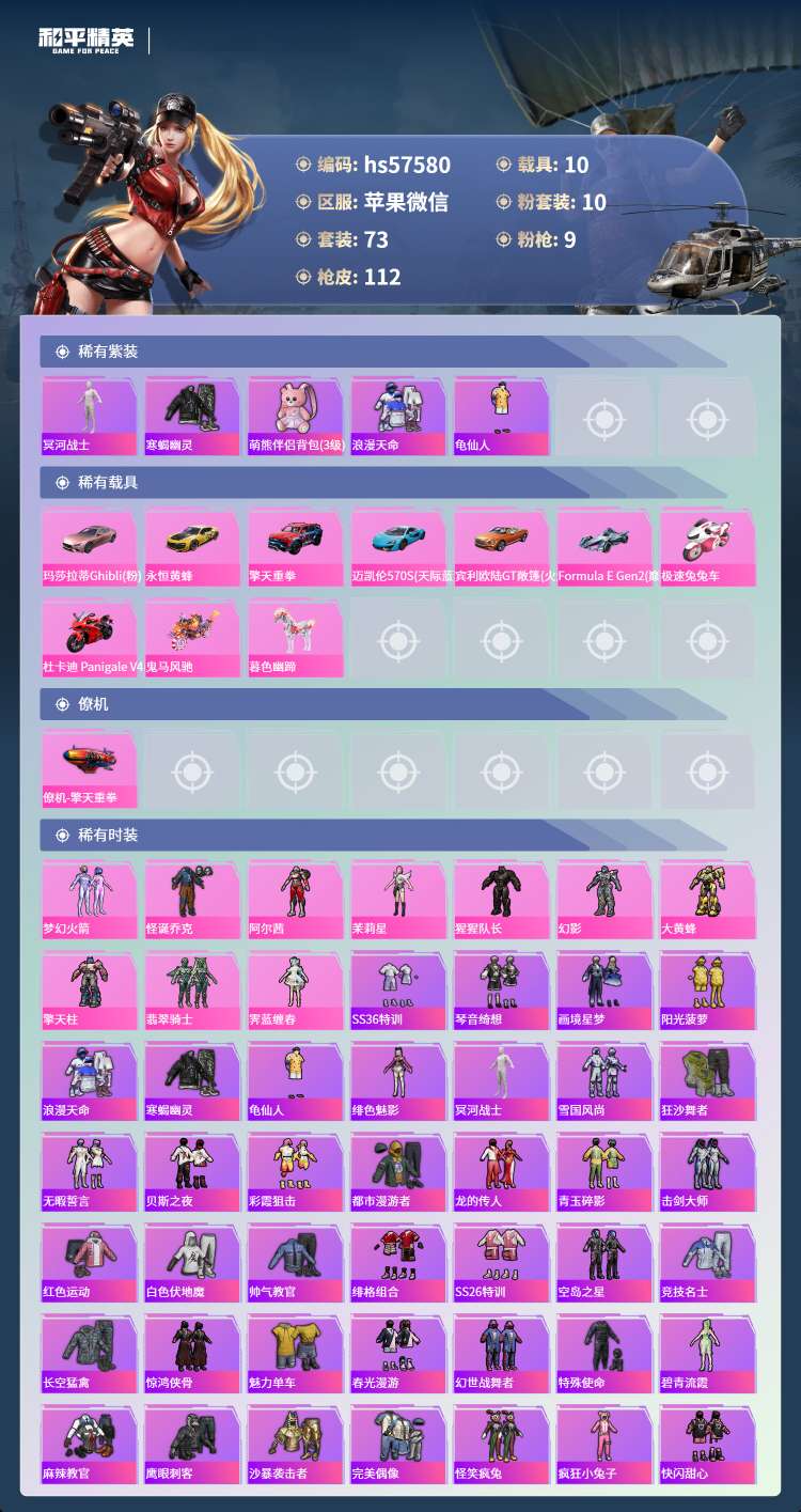 hs57580 苹果微-4王牌印记-10粉装-9特效枪-10载具-51864热力值-73套装-11