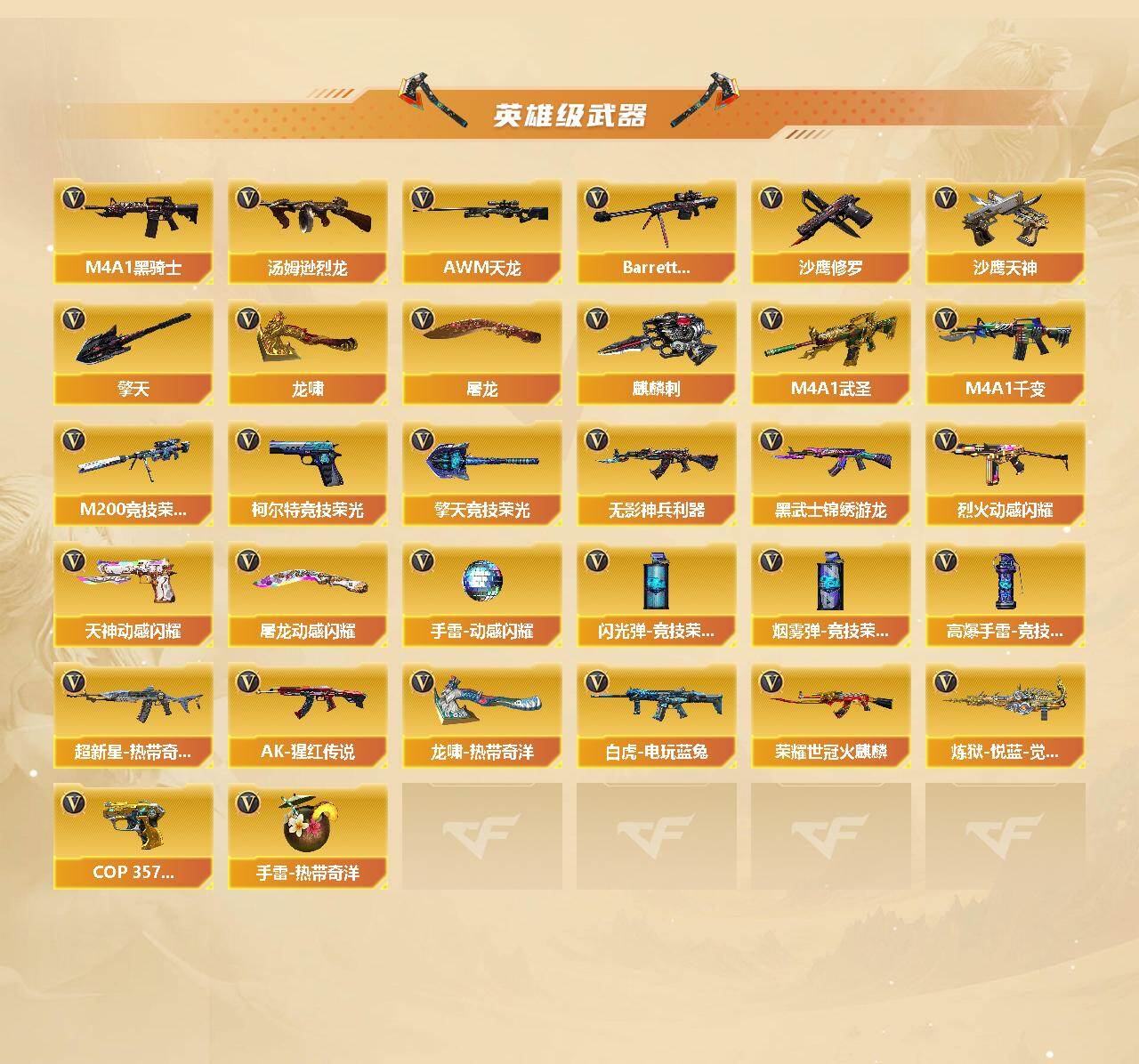 【热门武器】:传说光耀,QBZ03-金色蔷薇,Scar Light-白虎,HK417-朱雀*2,M200-竞技荣光,死亡之眼,荣耀世冠-火麒麟,白虎-电玩蓝兔,王者炎心,M4A1-黑骑士,汤姆逊-烈龙*6,金色蔷薇-空,沙鹰-修罗*5
