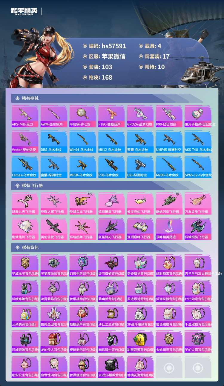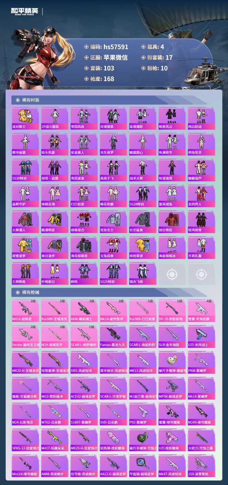 hs57591 苹果微-8王牌印记-有战神框-4红装-17粉装-10特效枪-4载具-65815热力