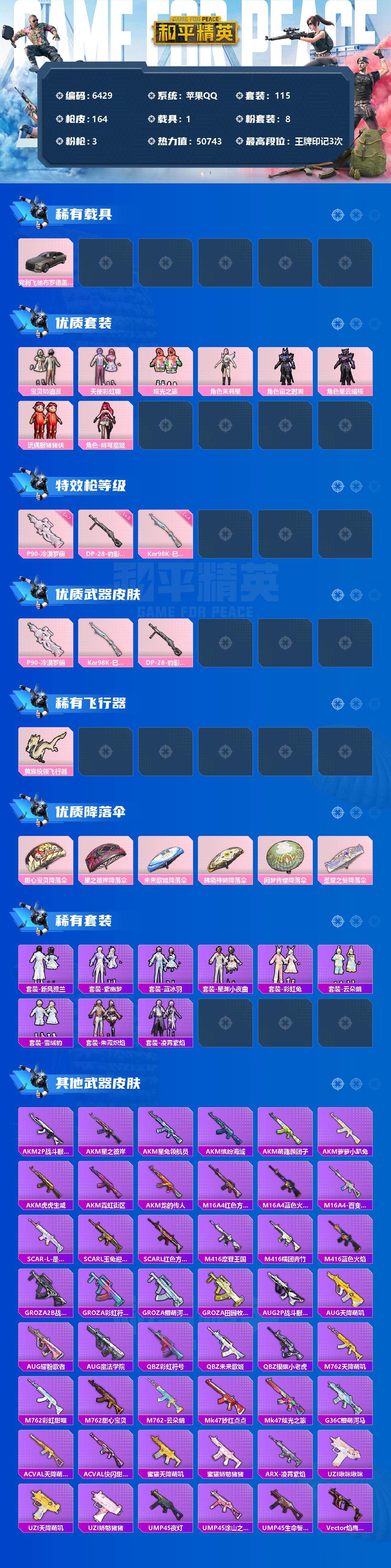 【6429】【商品标题】:苹果 手Q-8粉装-3特效枪-1载具-1粉色飞行器-50743热力值-3王牌印记-115套装-164枪皮