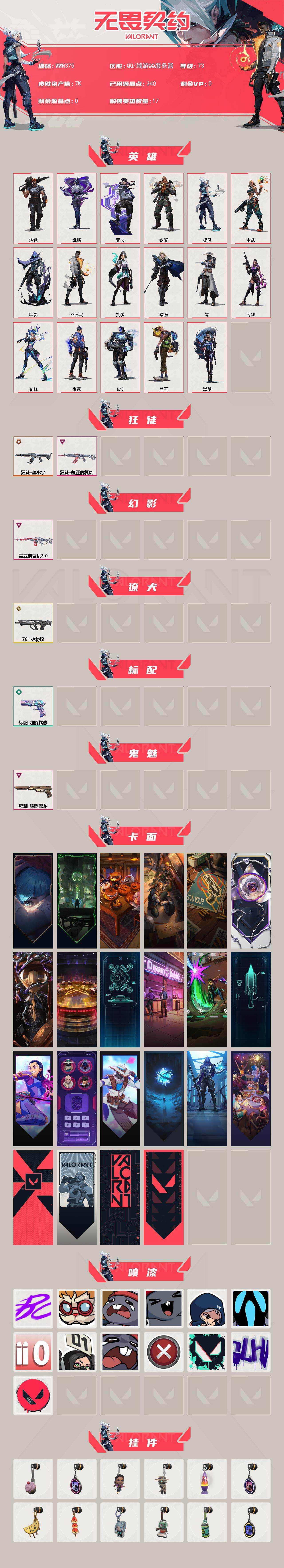 【WWN375】终极*1/传奇*1/卓越*3/皮肤*6/等级*73/段位:未定级/炼狱/维斯/壹决/铁臂/捷风/雷兹/幽影/不死鸟/贤者/猎枭/零/芮娜/霓虹/夜露/K/O/盖可/黑梦/狂徒-塑水宗/狂徒-盖亚的复仇/幻影-盖亚的复仇//2.0/獠犬-781-A协议/标配-超能偶像/鬼魅-耀鳞威龙/《双城之战》拥抱 卡面/欢迎来到底城 卡面/南瓜盛典 卡面/修车达人 卡面/正义的化身 卡面/铁之华 卡面/时间到 卡面/最高舞台 卡面/声感陷阱设计图 卡面/梦幻奶茶 卡面/源能反应 卡面/零点嗅探