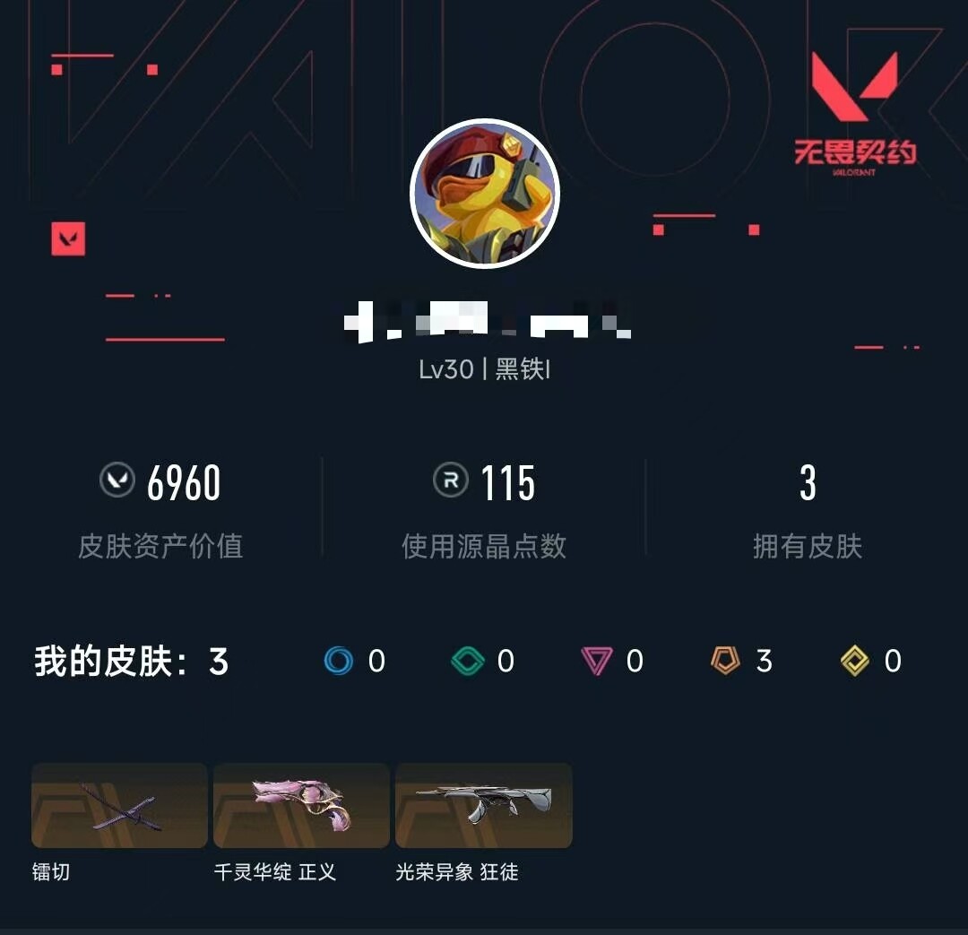 终极*3/皮肤*3/等级*30/段位:黑铁/