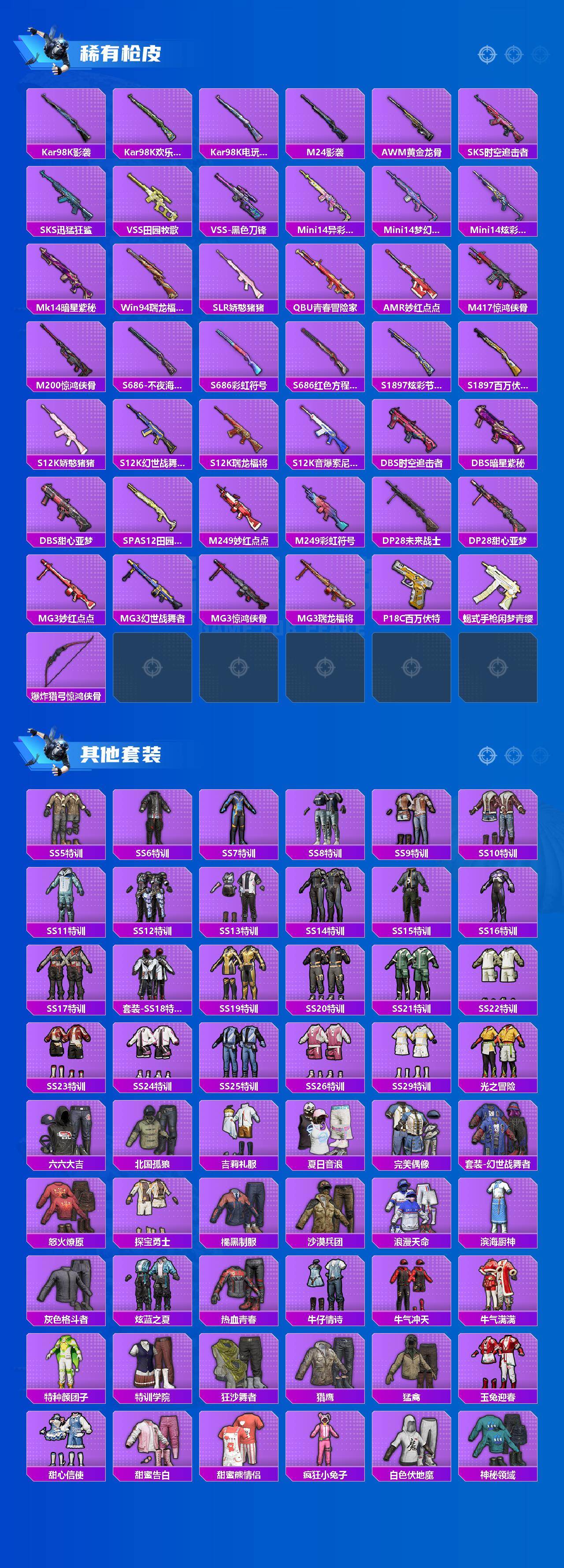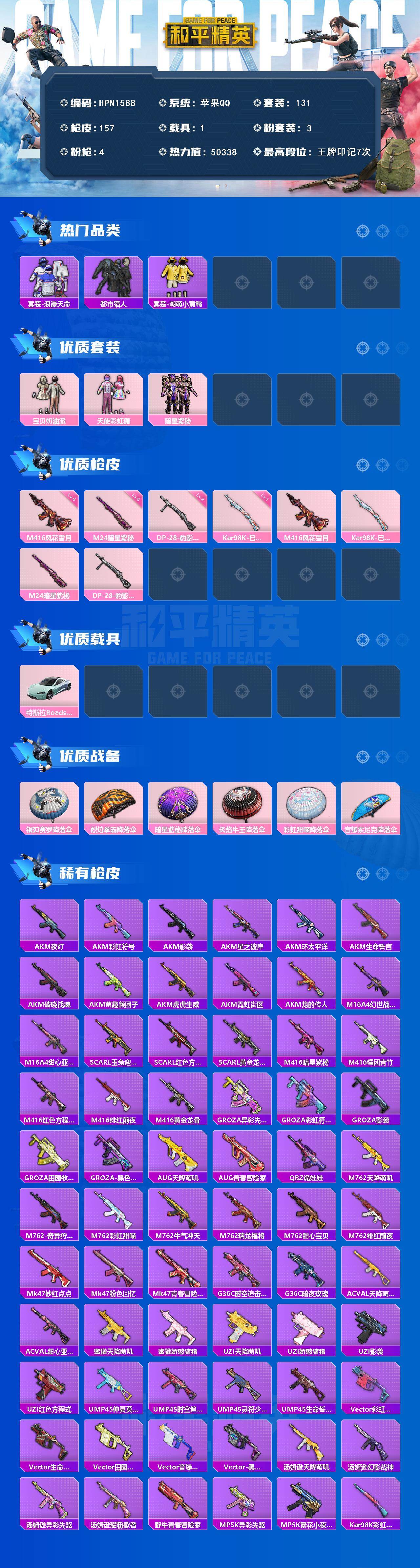 【HPN1588】131套装/枪械4/装备169/载具1/战备114/王牌印记7/热力值50338/六级M416-风花雪月/一级Kar98K-巳巳如意/六级M24-暗星紫秘/二级DP-28-豹影疾电/套装-浪漫天命/都市猎人/套装-潮萌小黄鸭/宝贝奶油派/天使彩虹糖/暗星紫秘/特斯拉Roadster(水滴蓝)/M416-风花雪月/Kar98K-巳巳如意/M24-暗星紫秘/DP-28-豹影疾电/银刃赛罗降落伞/烈焰拳霸降落伞/暗星紫秘降落伞/炙焰牛王降落伞/彩虹甜喵降落伞/音爆索尼克降落伞/AKM