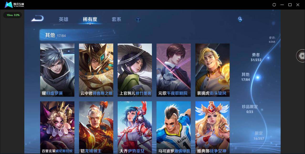 实名: 可修改 贵族等级: V2 英雄数: 80 皮肤数: 55 传说皮: 地