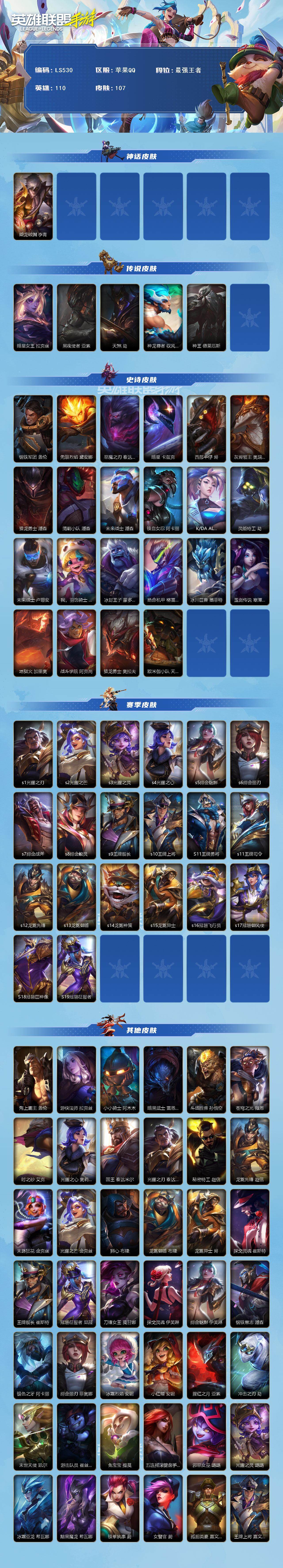 【LS530】110英雄/107皮肤/最强王者/乘龙破渊 李青/暗星女王 拉克丝/黑夜使者 亚索/天煞 劫/神龙尊者 驭风啸龙 易/神王 德莱厄斯/钢铁军团 盖伦/无限烈焰 黛安娜/恶魔之刃 泰达米尔/暗星 卡兹克/西部牛仔 烬/灰烬领主 奥瑞利安·索尔/猎龙勇士 潘森/清剿小队 潘森/未来战士 潘森/铁血女忍 阿卡丽/K/DA ALL OUT 阿卡丽/灵能特工 劫/未来战士 卢锡安/我,羽饰骑士 崔丝塔娜/冰封王子 蒙多医生/绝命机甲 格雷福斯/冰川巨兽 墨菲特/玉剑传说 寒潭夭夭 娜美/地狱