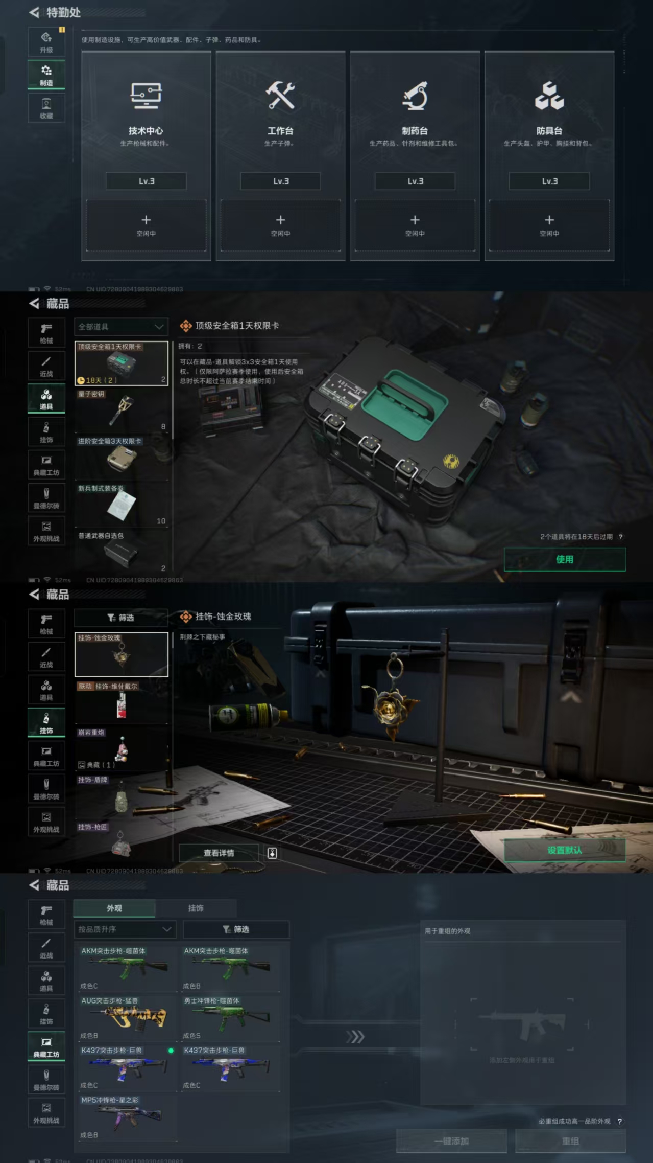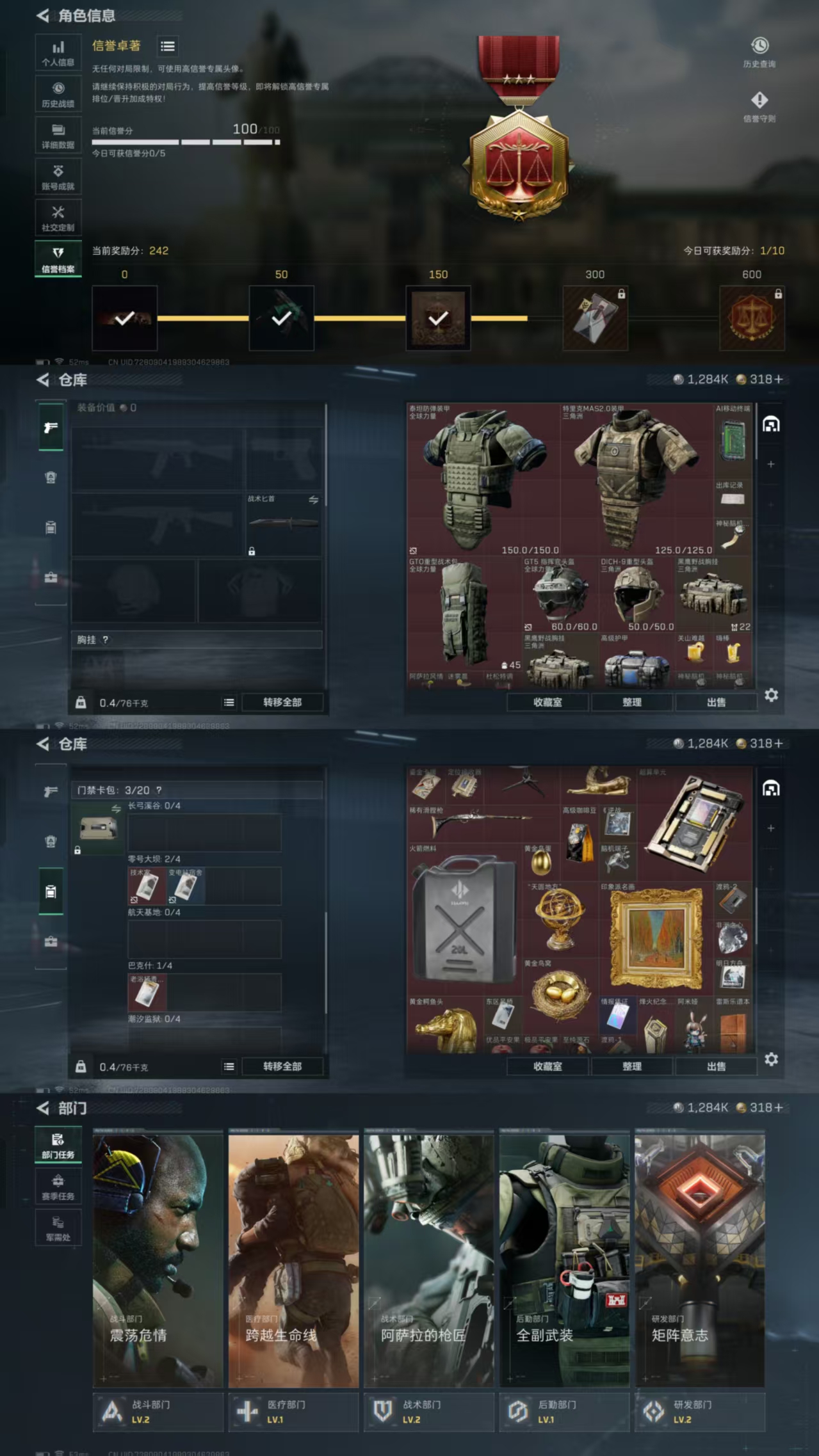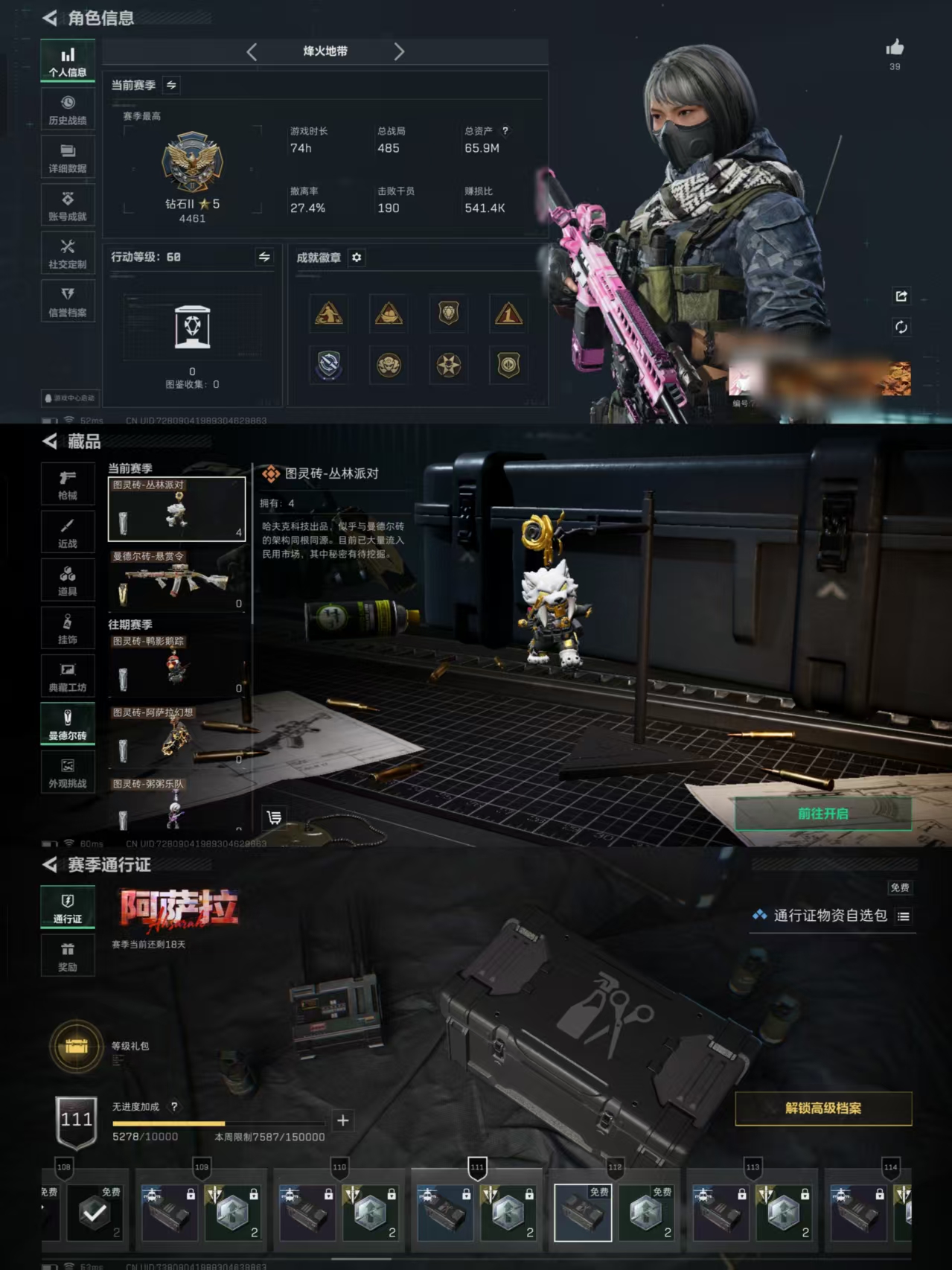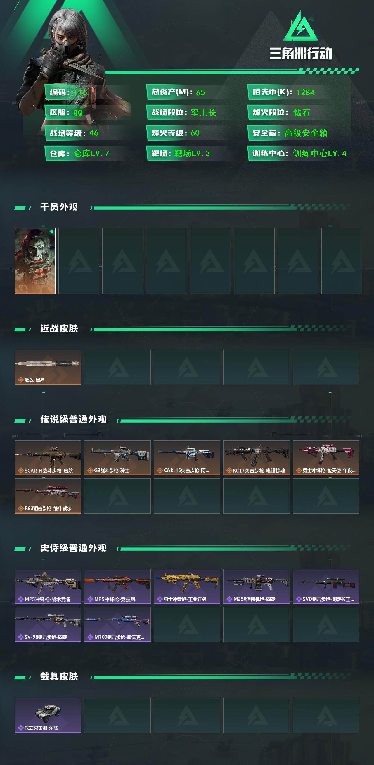 等级60级 仓库价值65M 哈夫币1284K 干员皮肤1 红狼 电锯惊魂