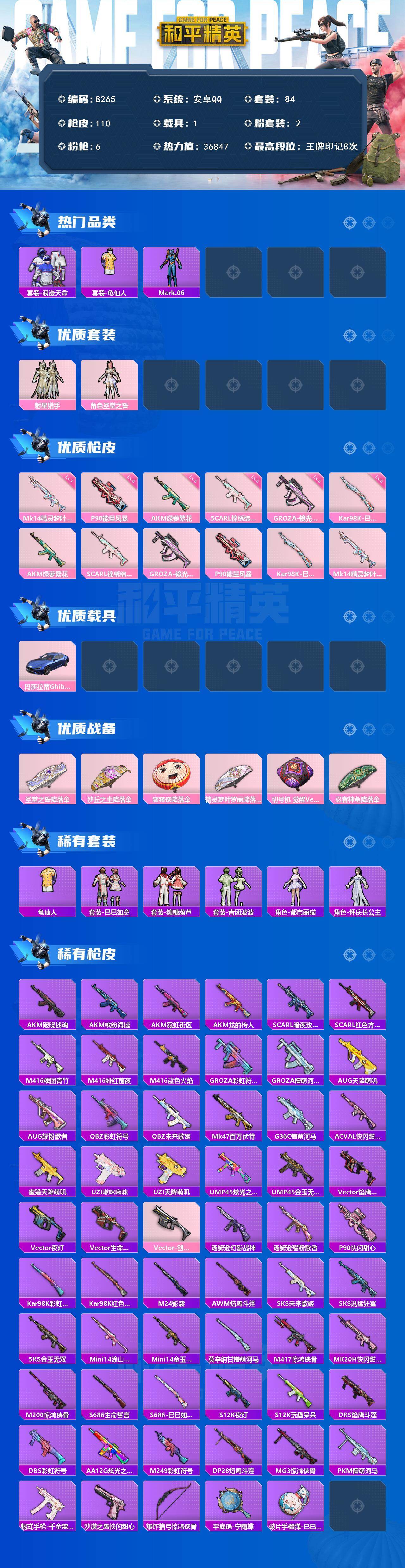 【8265】2粉装-6特效枪-1载具-0粉色飞行器-36847热力值-8王牌印记-84套装-110枪皮