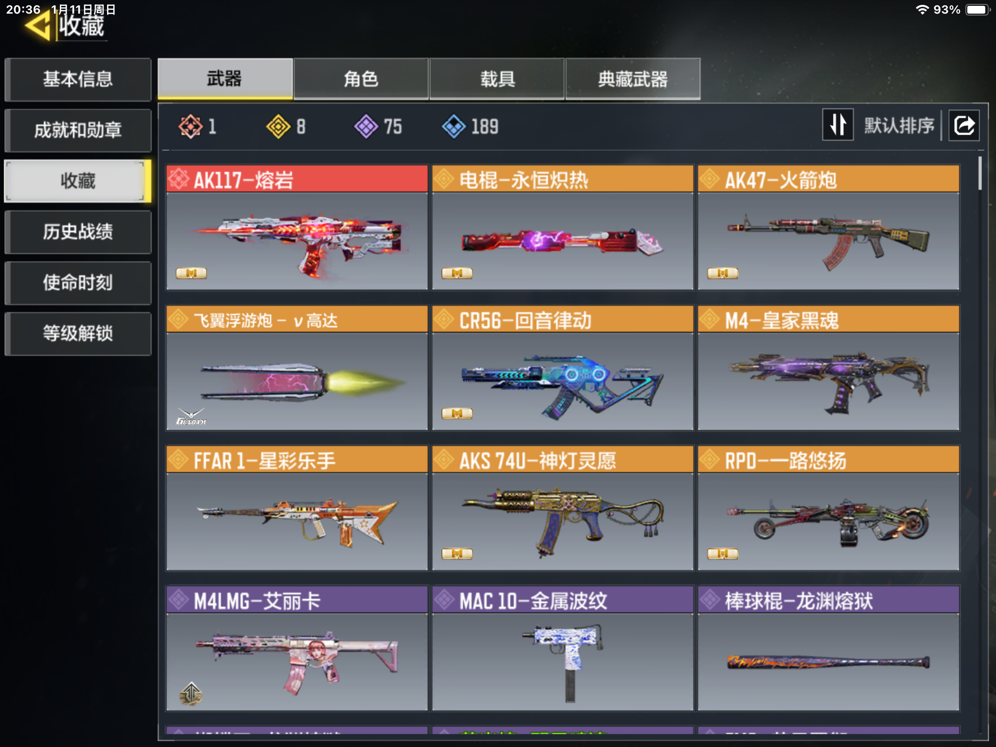 MHZ2523苹果Q-等级314-史诗枪械75 【1神话】 AK117-熔岩 【8传说】 电棍-永恒炽热 AK47-火箭炮 飞翼浮游炮-v高达 CR56-回音律动 M4-皇家黑魂 FFAR1-星彩乐手 AKS 74U-神灯灵愿 RPD-一路悠扬