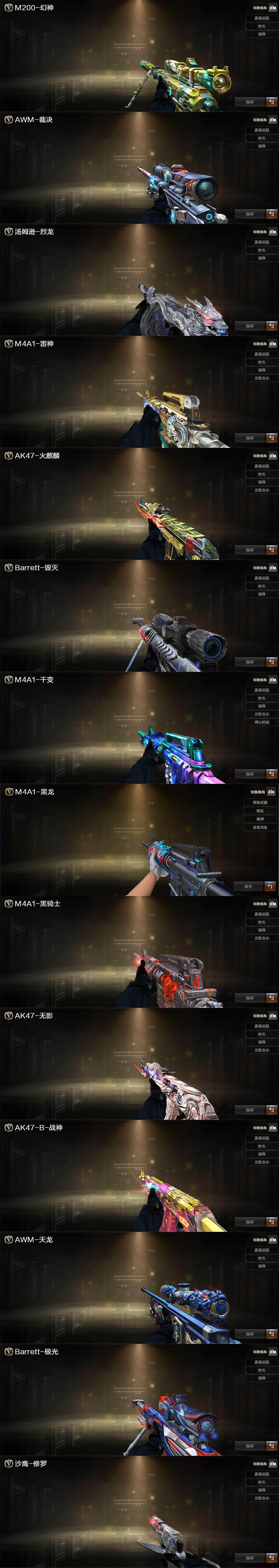 【热门武器】:QBZ03-金色蔷薇,HK417-朱雀,M200-幻神,M200-竞技荣光,金色小号,M4A1-黑骑士,汤姆逊-烈龙,加特林-炼狱,USP-雷暴,沙鹰-修罗