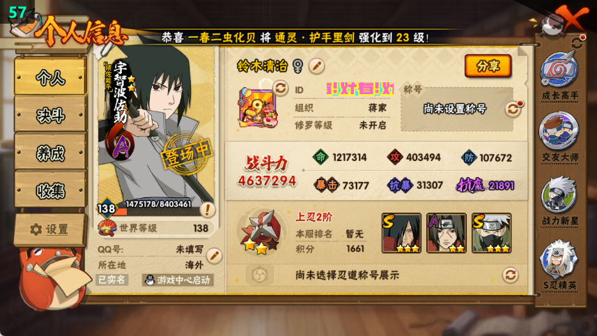 463w须卡+红狗11s+泳装鼬18A战力463忍者总数11