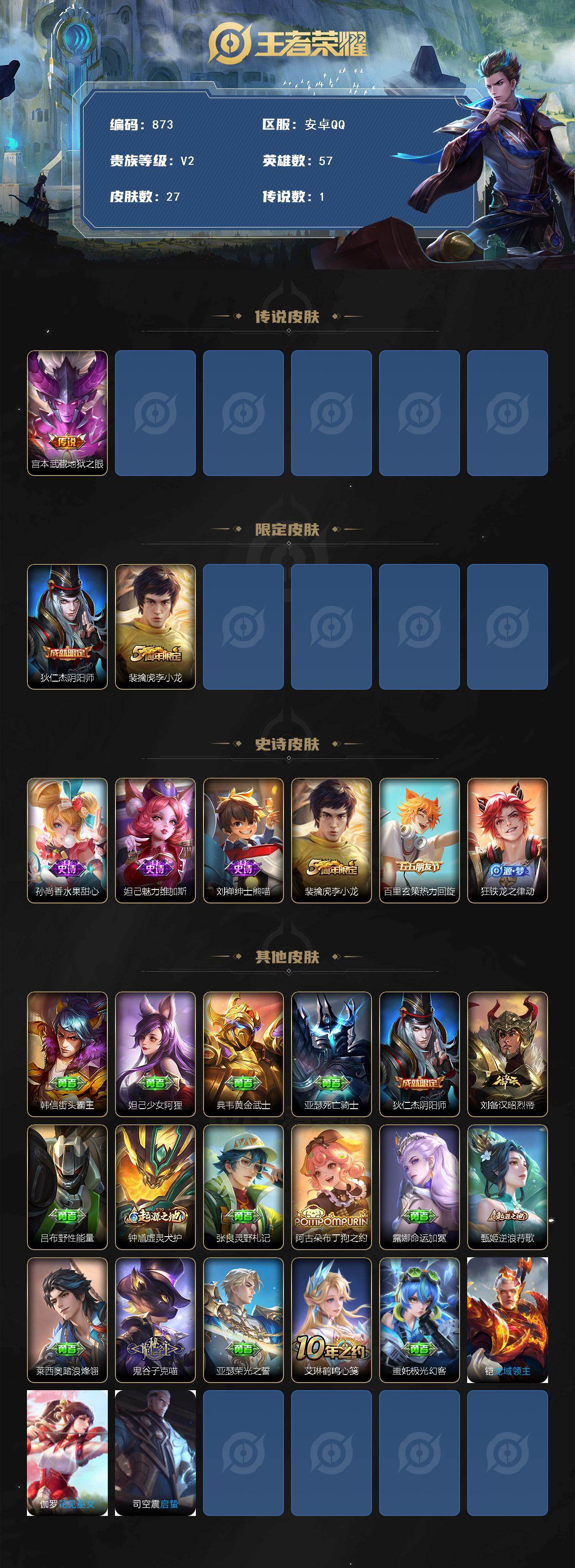 1992698 王者荣耀账号 安卓Q-V2-尊贵铂金III段位-57英雄-27皮肤-1传说-6史诗