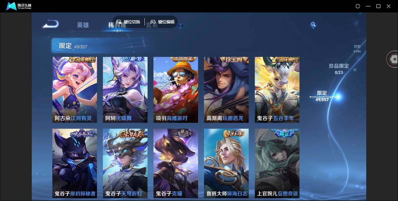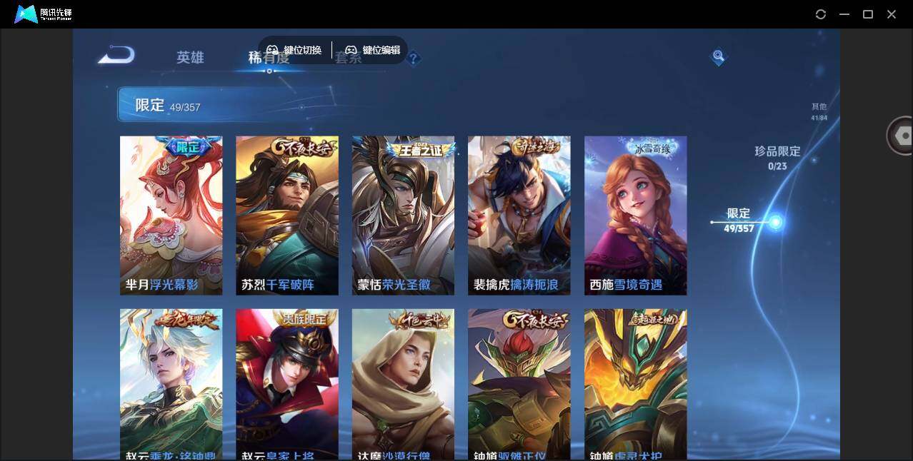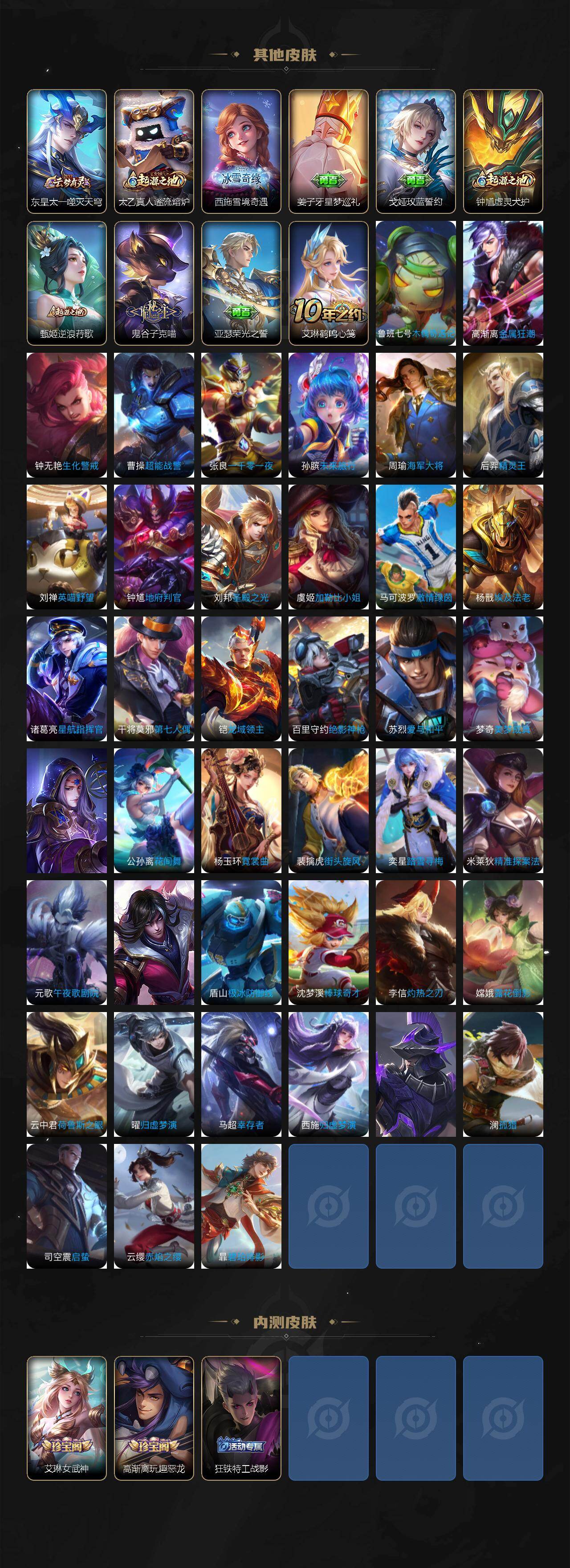 【限定皮肤】:蒙犽顽岩魄,姜子牙天穹之誓,狄仁杰阴阳师,赵云皇家上将,墨子神迹守卫,庄周高山流水,高渐离玩趣恶龙