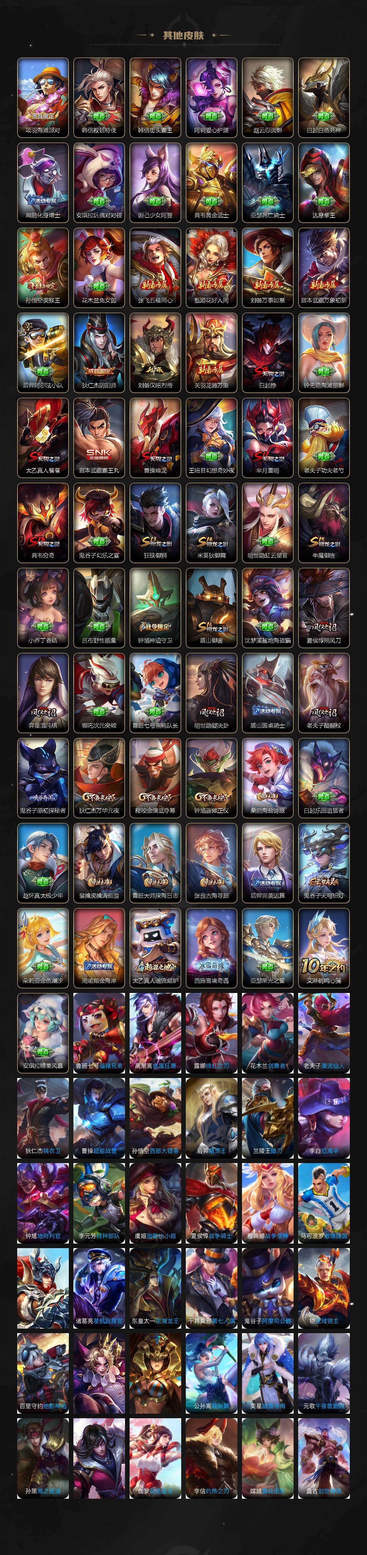 【限定皮肤】:白起狰,狄仁杰阴阳师,赵云皇家上将,鲁班七号狮舞东方,芈月重明,夏侯惇朔风刀,曹操烛龙,典韦穷奇,狄仁杰魔术师,狄仁杰万华元夜,项羽海滩派对,老夫子醍醐杖,程咬金演武夺筹,孙悟空美猴王,牛魔御旌,钟馗神迹守卫,