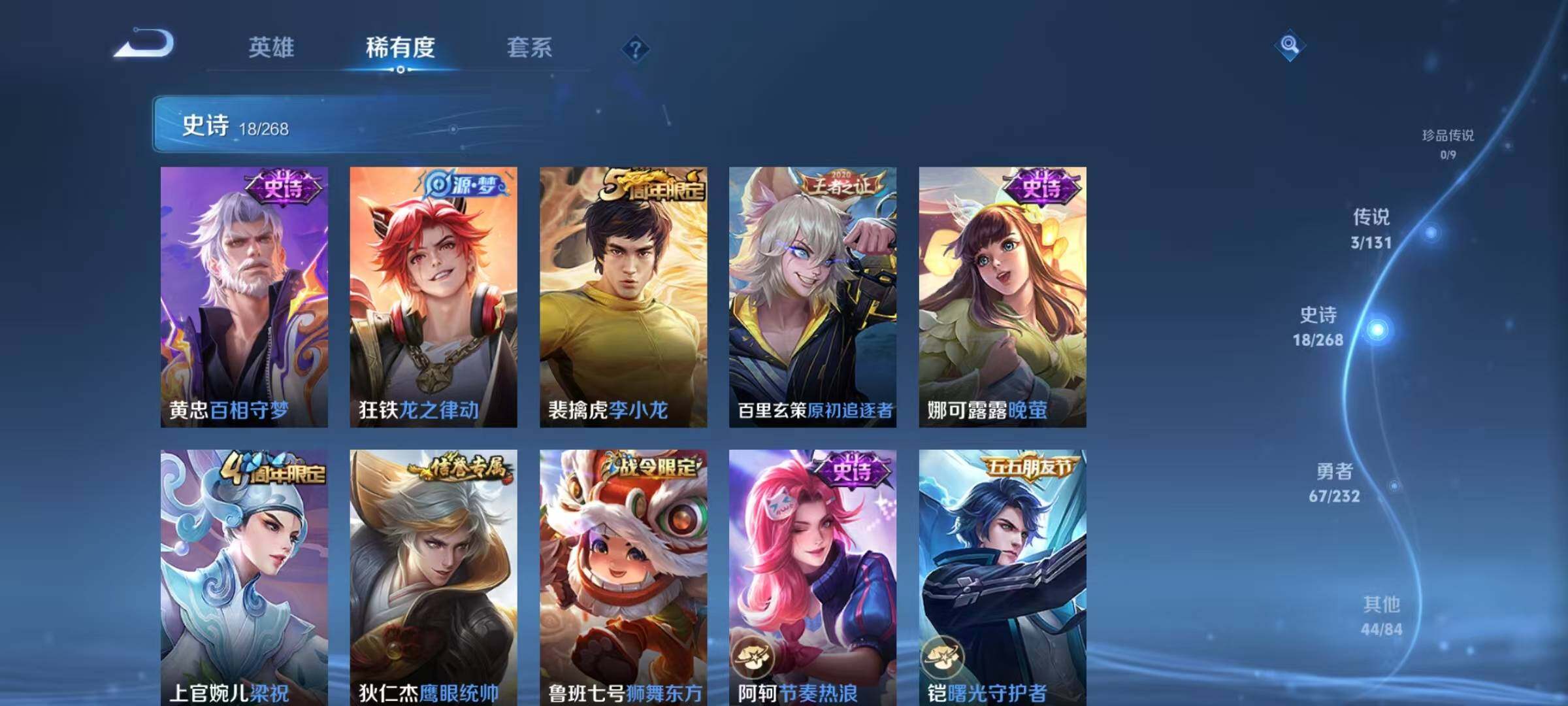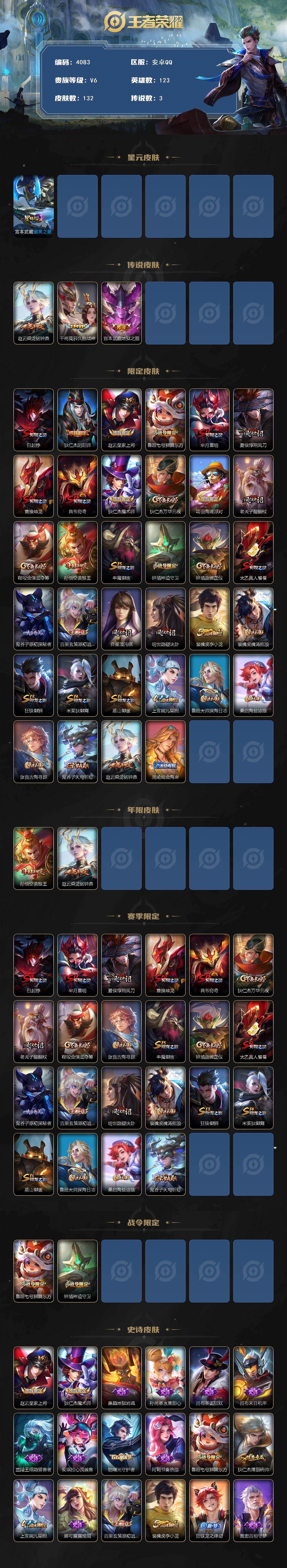 安卓Q-V6-永恒钻石III段位-123英雄-132皮肤-3传说-18史诗