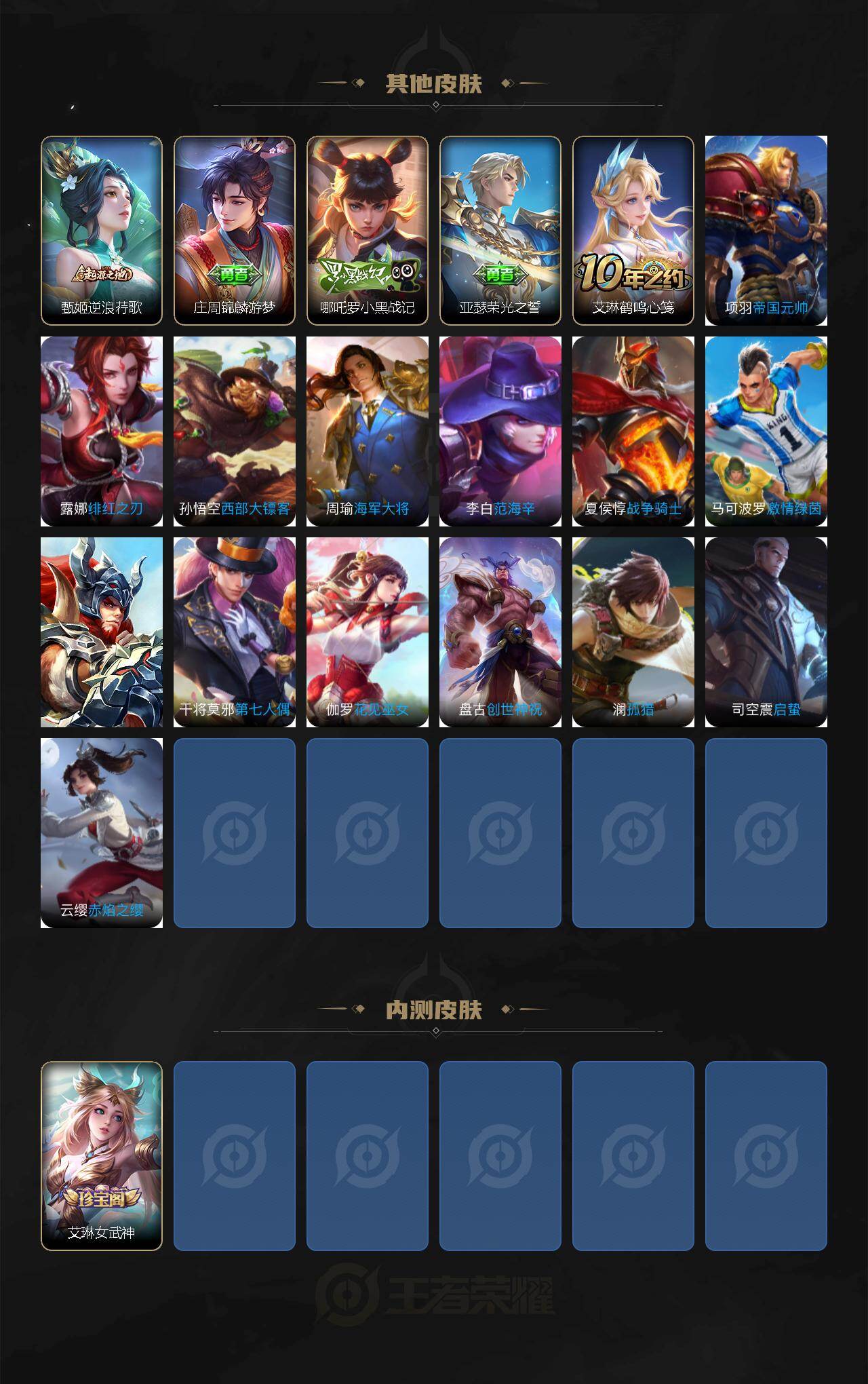 【限定皮肤】:蔡文姬夏日便利店,虞姬夏日便利店,姜子牙天穹之誓,狄仁杰阴阳师,项羽海滩派对,裴擒虎李小龙,艾琳女武神,鬼谷子天穹祈灯,沈梦溪龙舞盛年,刘邦剑破天穹,程咬金群星魔术团,周瑜熔金海岸