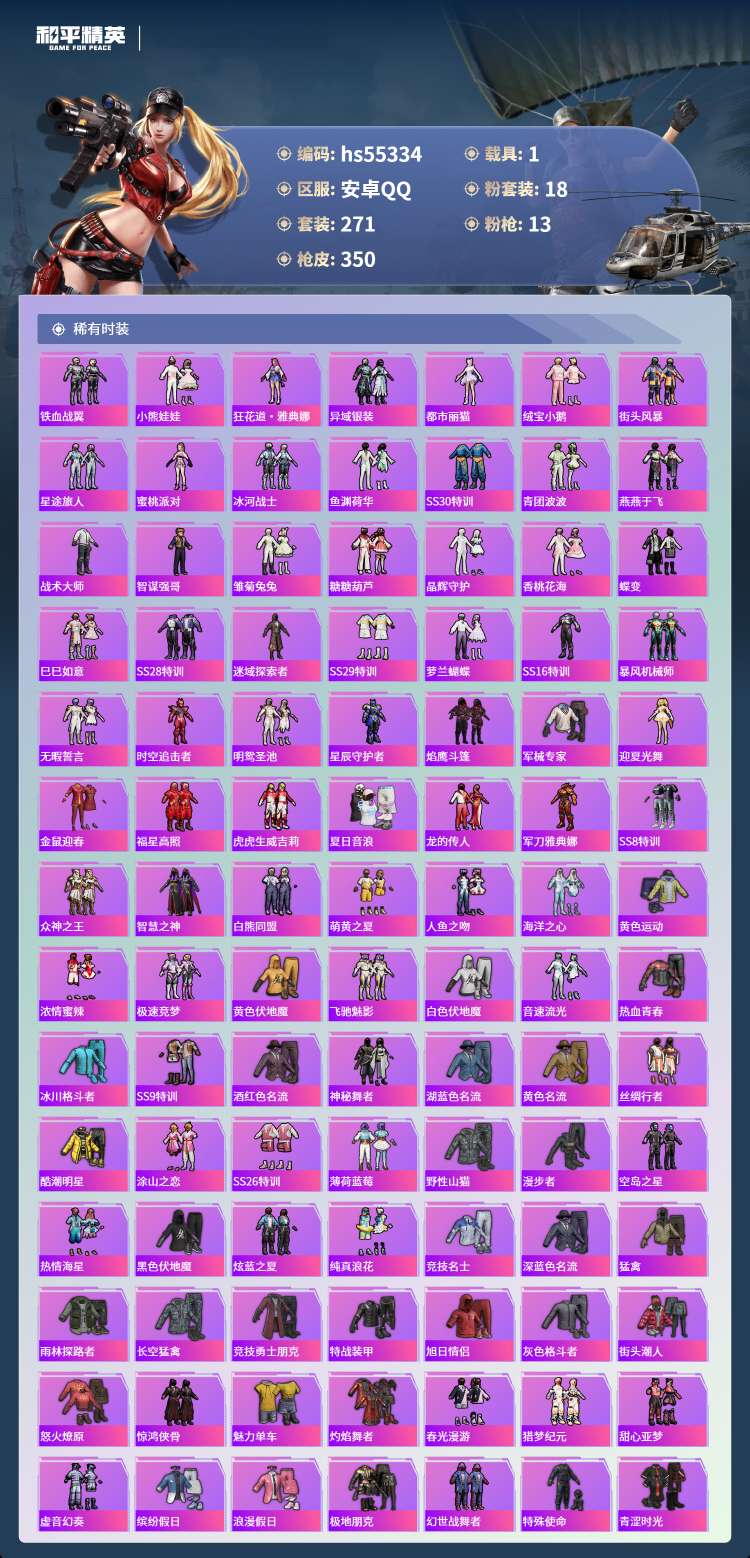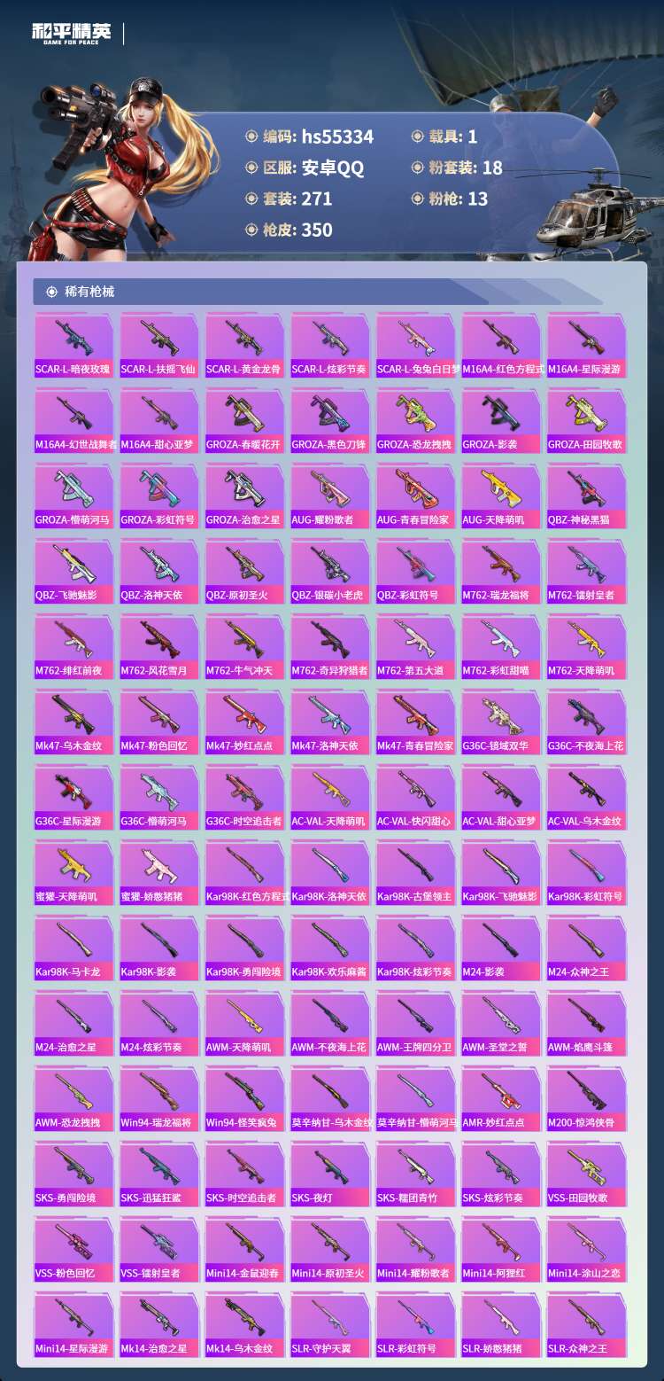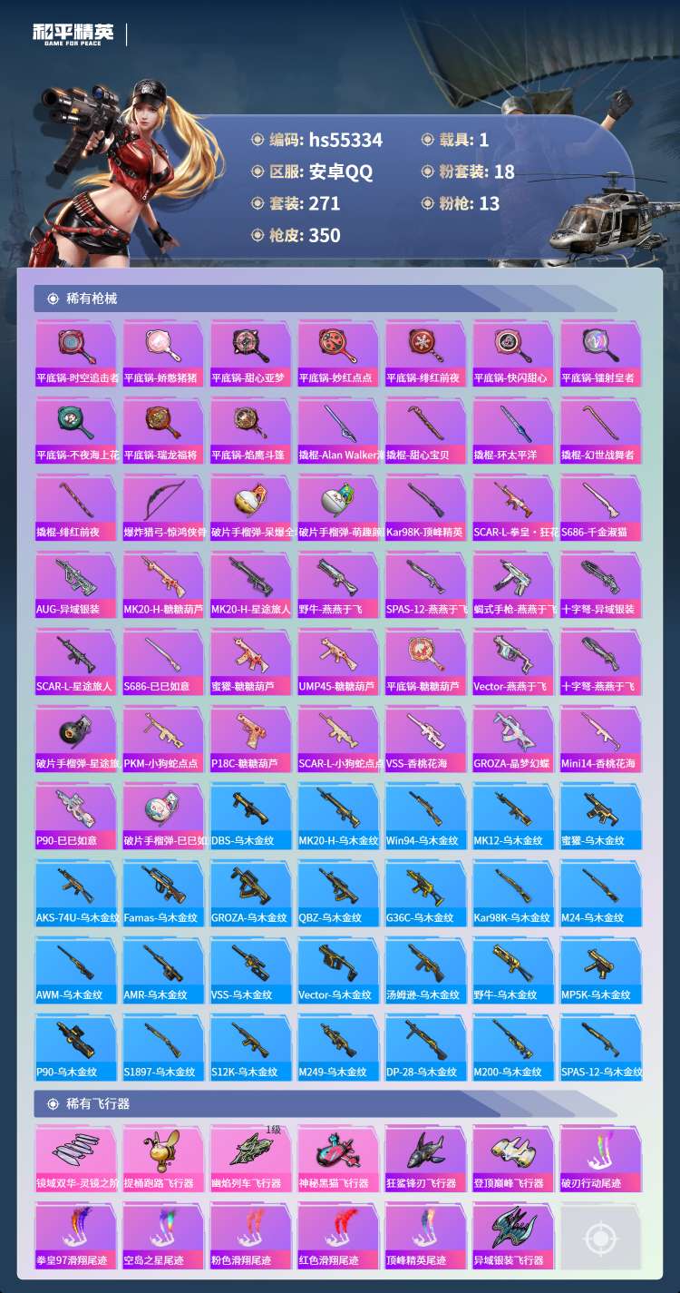 hs55334 安卓手Q-23王牌印记-有战神框-18粉装-13特效枪-1载具-119523热力值-