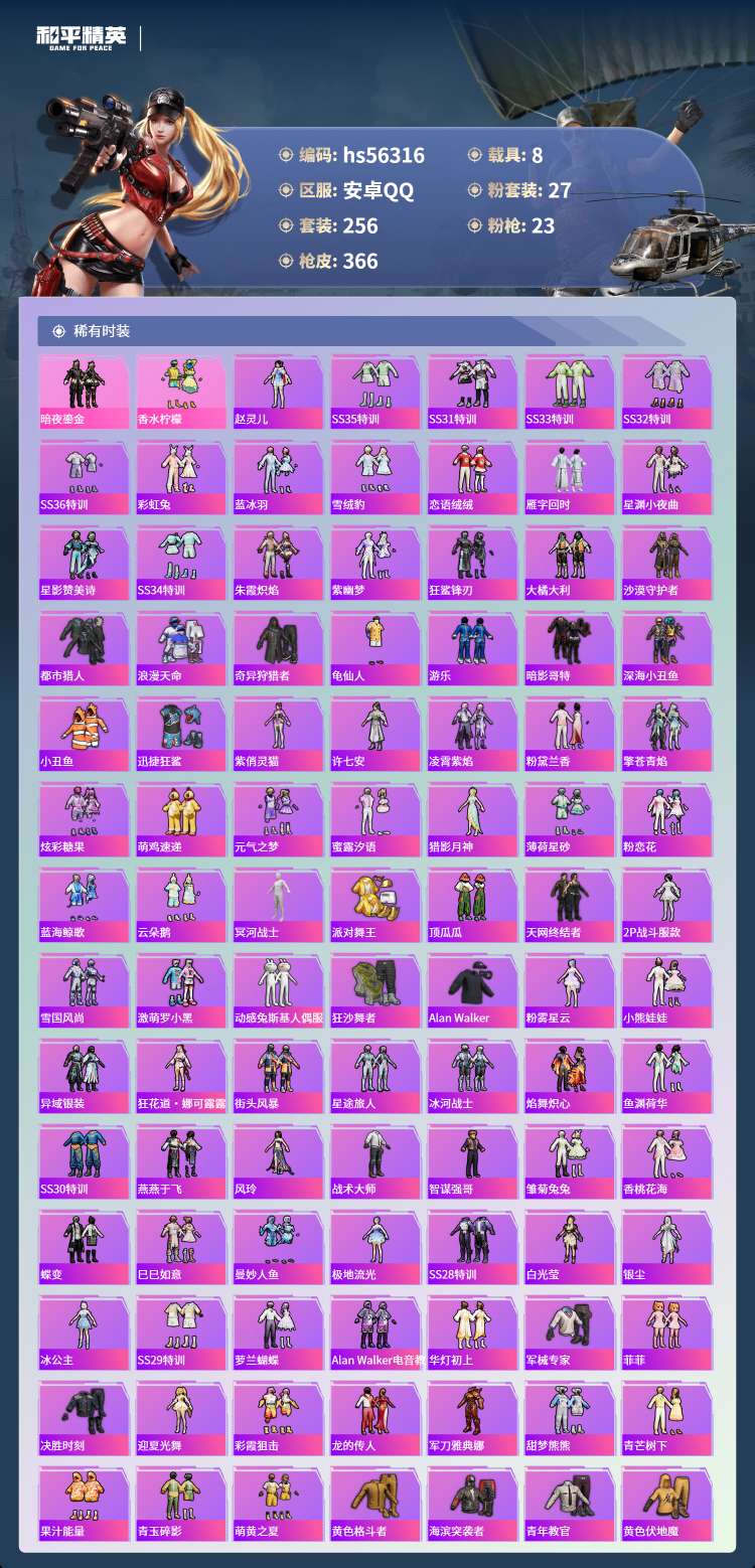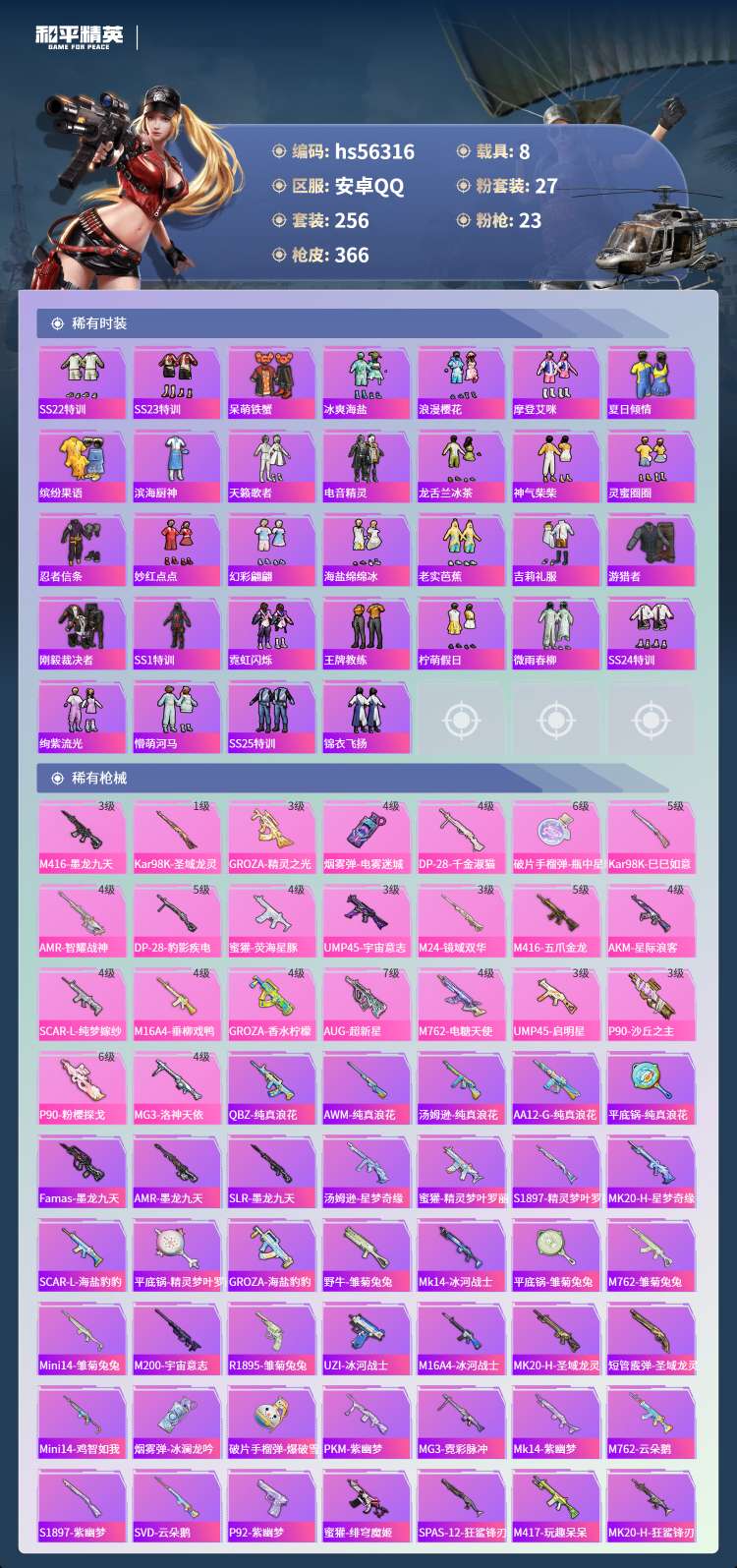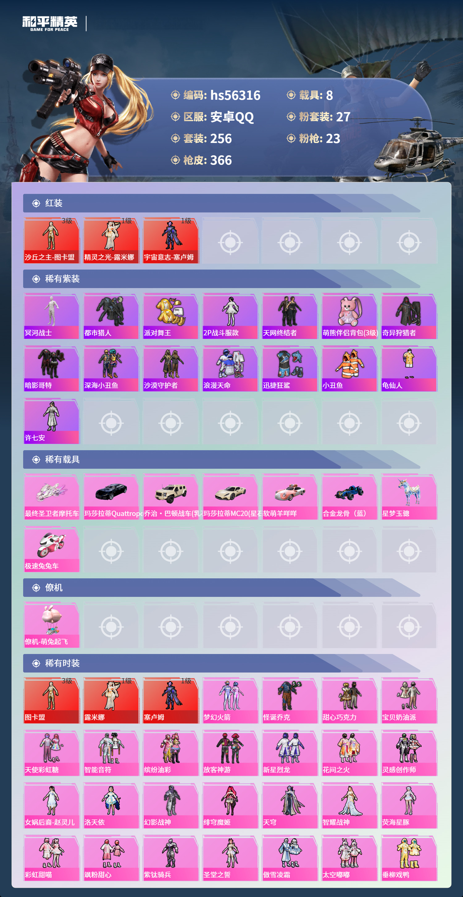 hs56316 安卓手Q-17王牌印记-有战神框-3红装-27粉装-23特效枪-8载具-141273