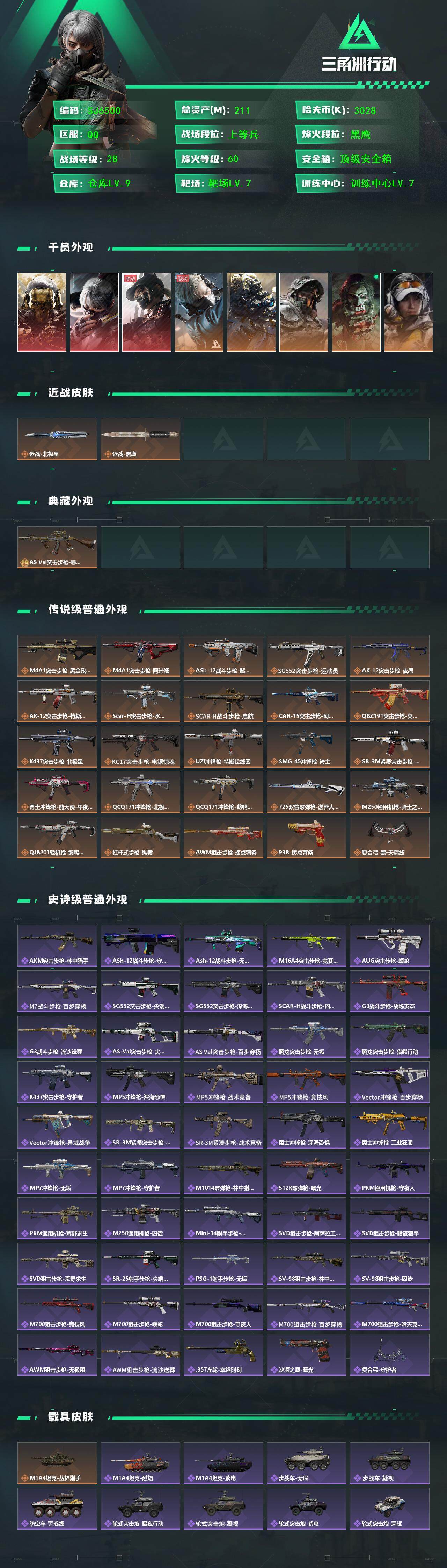 总资产(M):211M/哈夫币(K):3028K/哈夫币(K):3028K/传说枪皮数:26/全面战