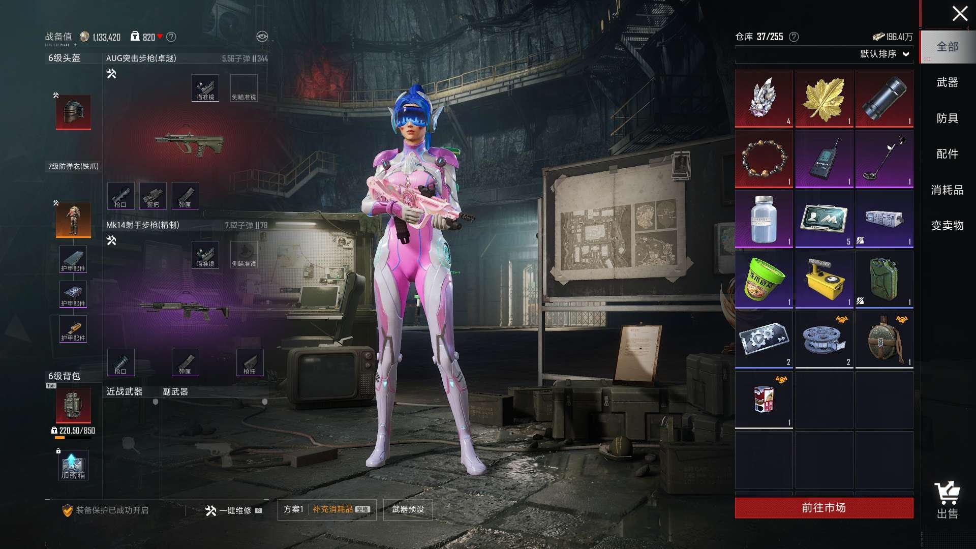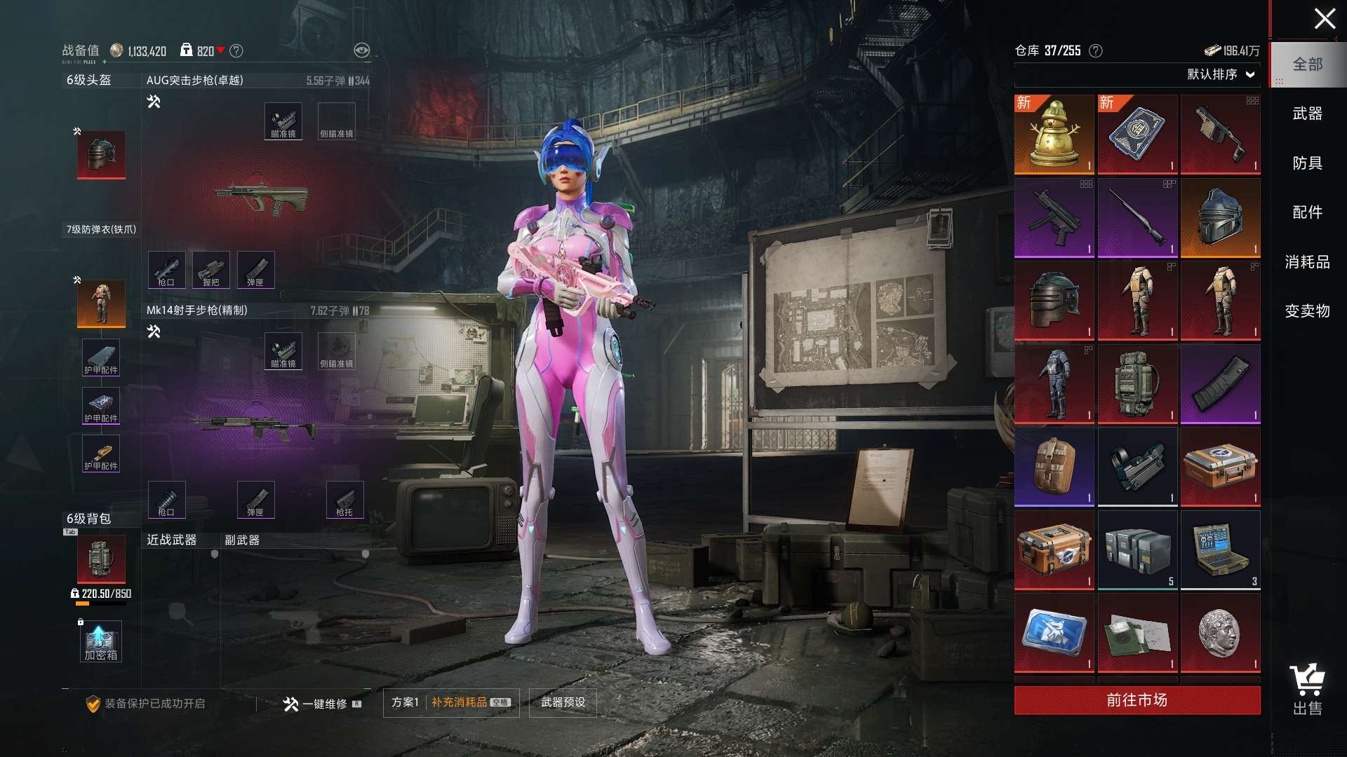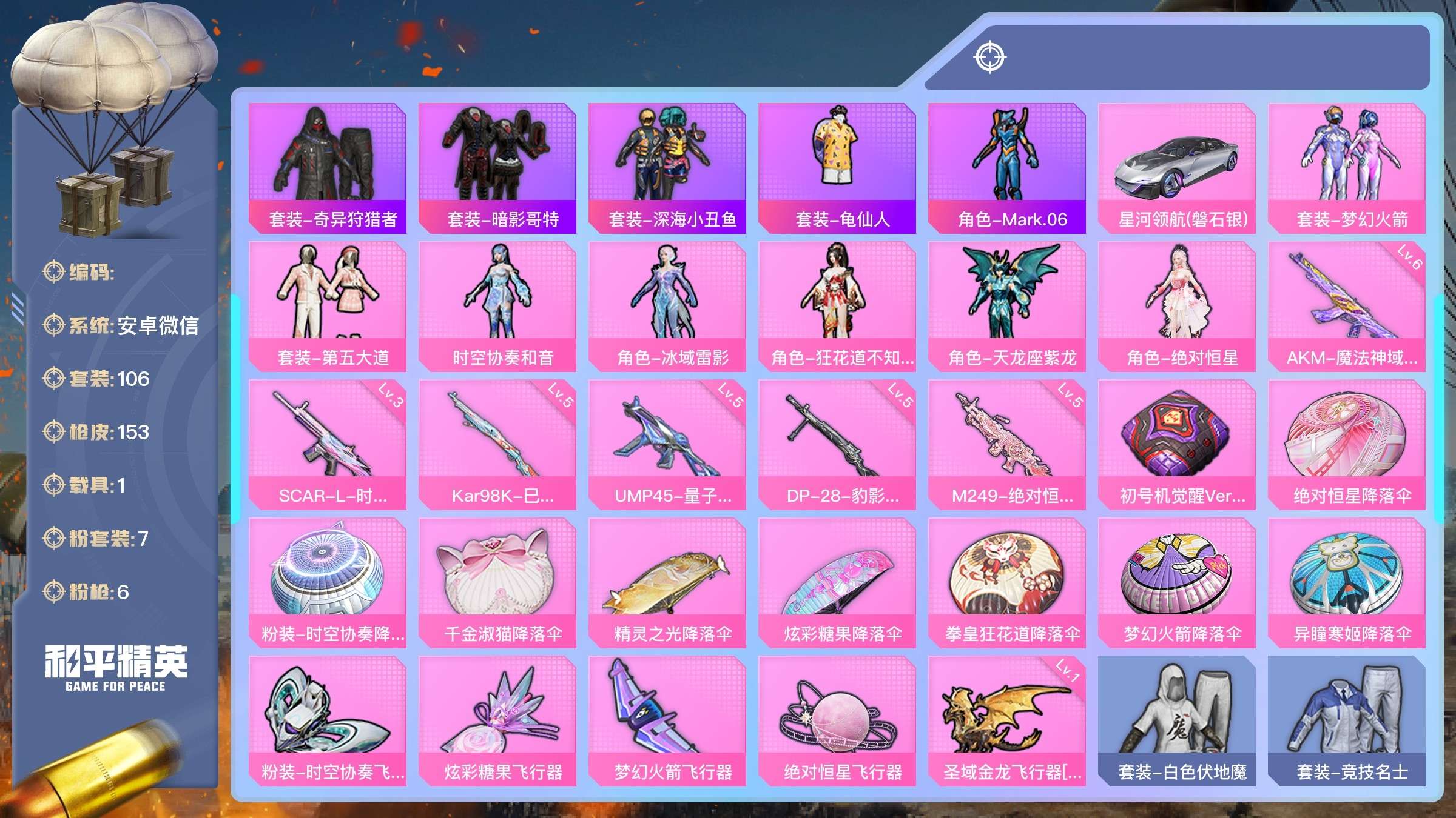 a4212/安卓微/热力值:49884,7粉装,6粉枪,1载具,14粉色战备,106套装,153枪
