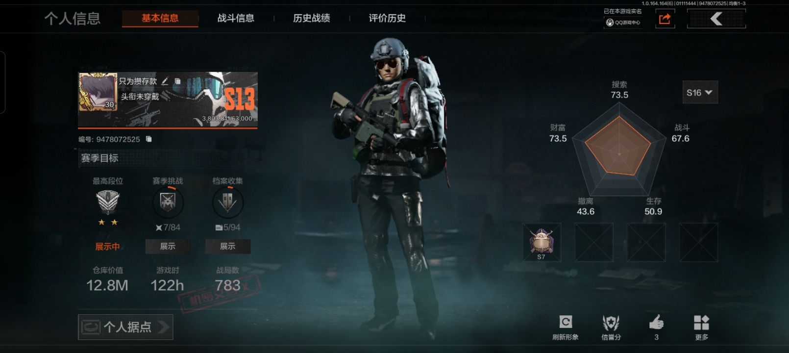 FY5960,总资产12.8m,近战武器,工兵铲,角色装扮(紫),财团之手作战套装,都市夜影套装,紫色枪皮,棱光裂变AKM,炎夏浪花AR57,娜迦RPK16,白狼连队VSS,骑士之剑Groza,暗区突围安卓Q区实名可修改