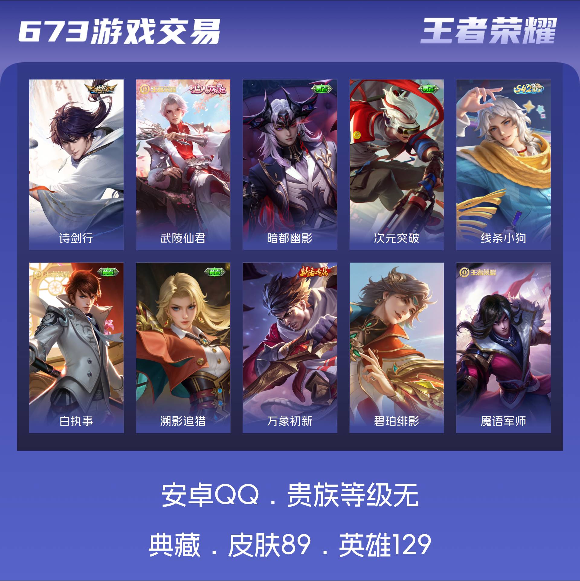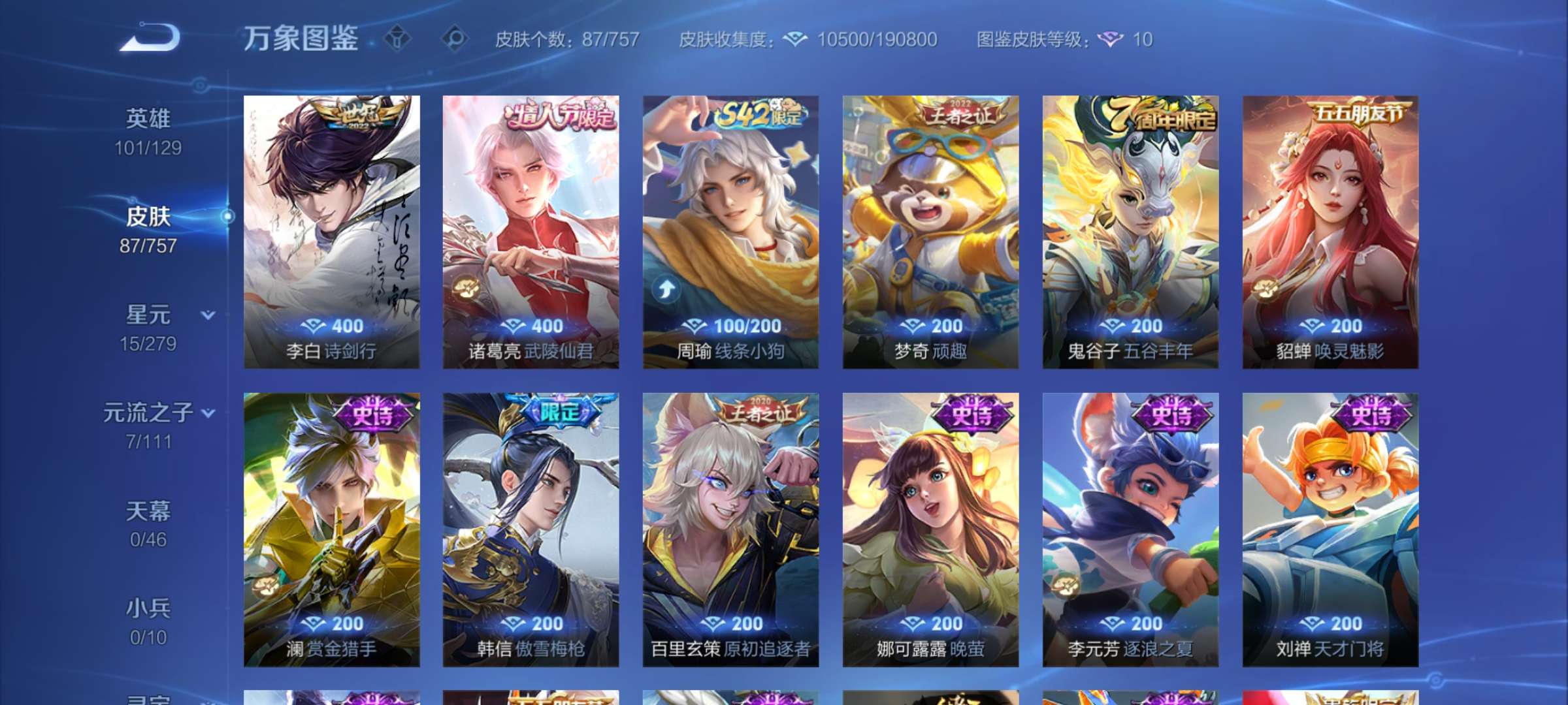 皮肤89 英雄129 至尊星耀 传说2 其他皮肤93