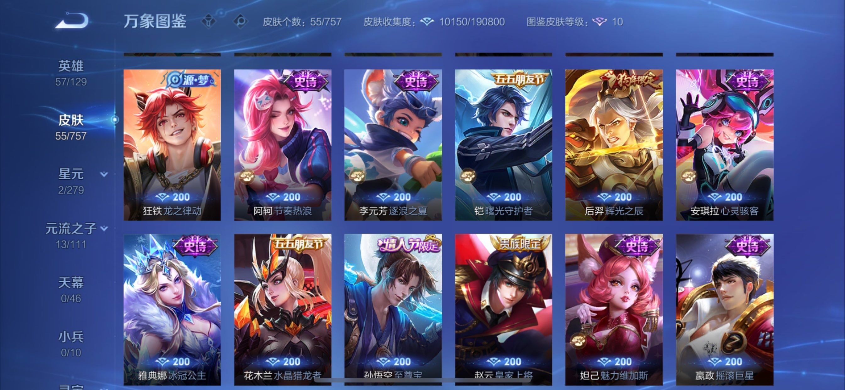 可换绑【诸葛亮无双 暃珍品 至尊宝 多传说限定号】5按键 五级铭文11 可二次BX3247 苹果Q-V6-55皮肤-1无双-1珍品传说-4传说-24史诗【无双皮肤】:诸葛亮天机白泽【珍品传说】:暃朽木白哉【传说皮肤】:大司命死亡执政官,赵云淬星耀世,干将莫邪久胜战神,后羿黄金射手座【限定皮肤】:狄仁杰阴阳师,赵云皇家上将,狄仁杰魔术师,项羽海滩派对,孙悟空至尊宝,