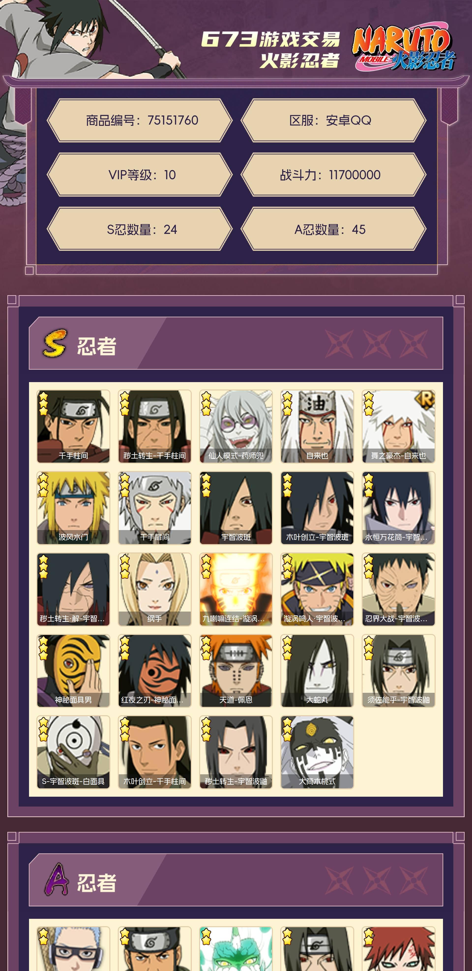 角色等级149 金币300 战斗力11700000 S忍24 A忍45 5星S忍者20 10 段位超