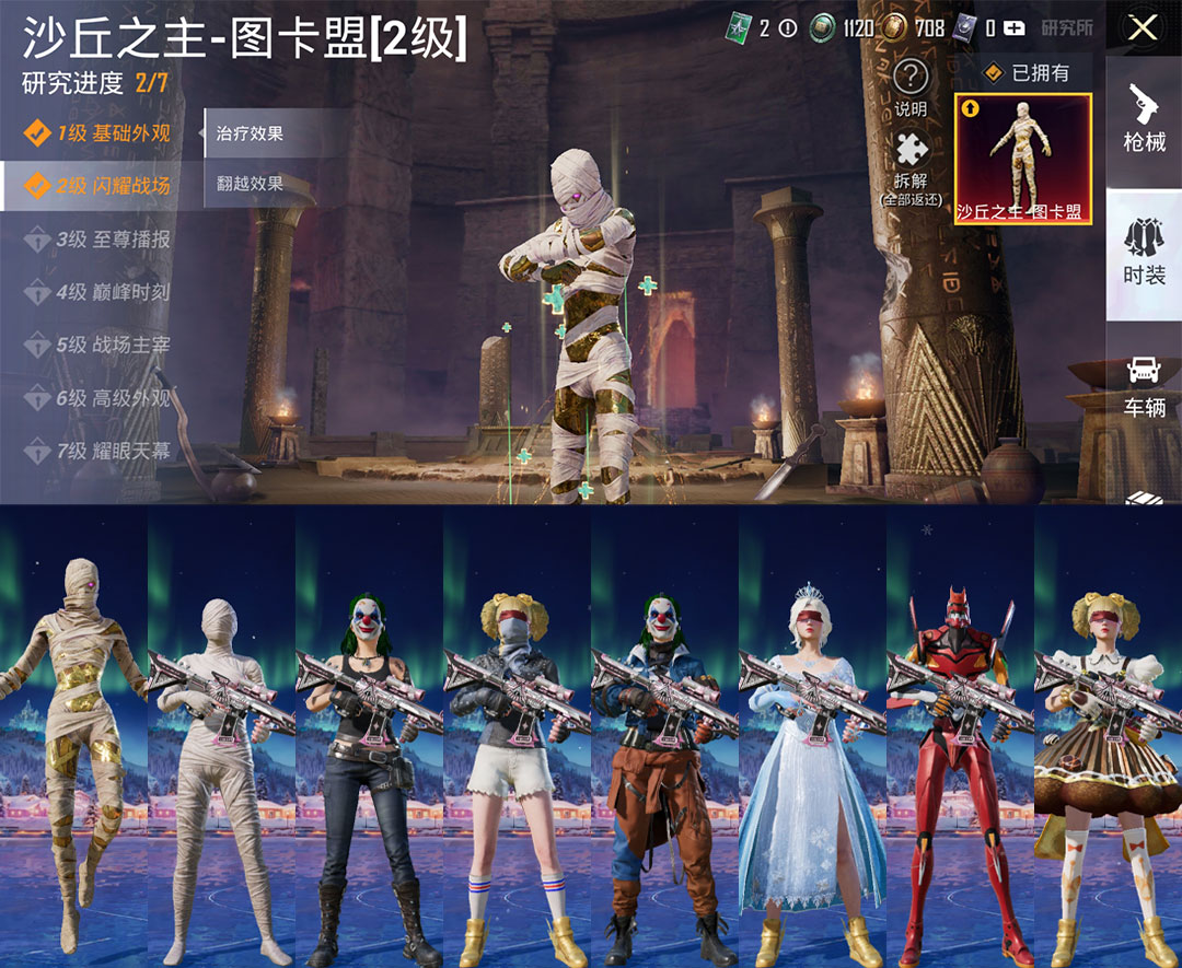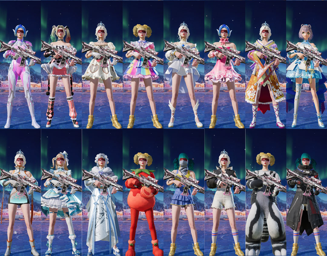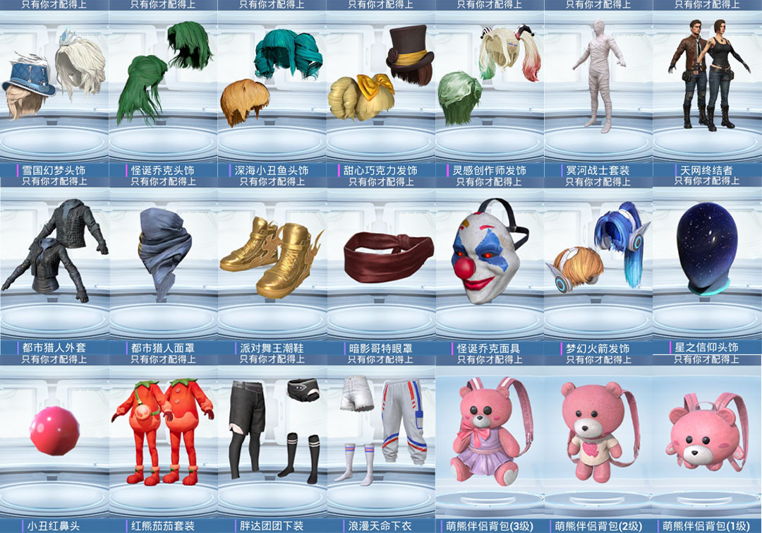 紫装:天网终结者, 派对舞王,奇异狩猎者,都市猎人,红熊茄茄,粉蓝蚂蚱,银碳小老虎,胖达团团,深海小丑