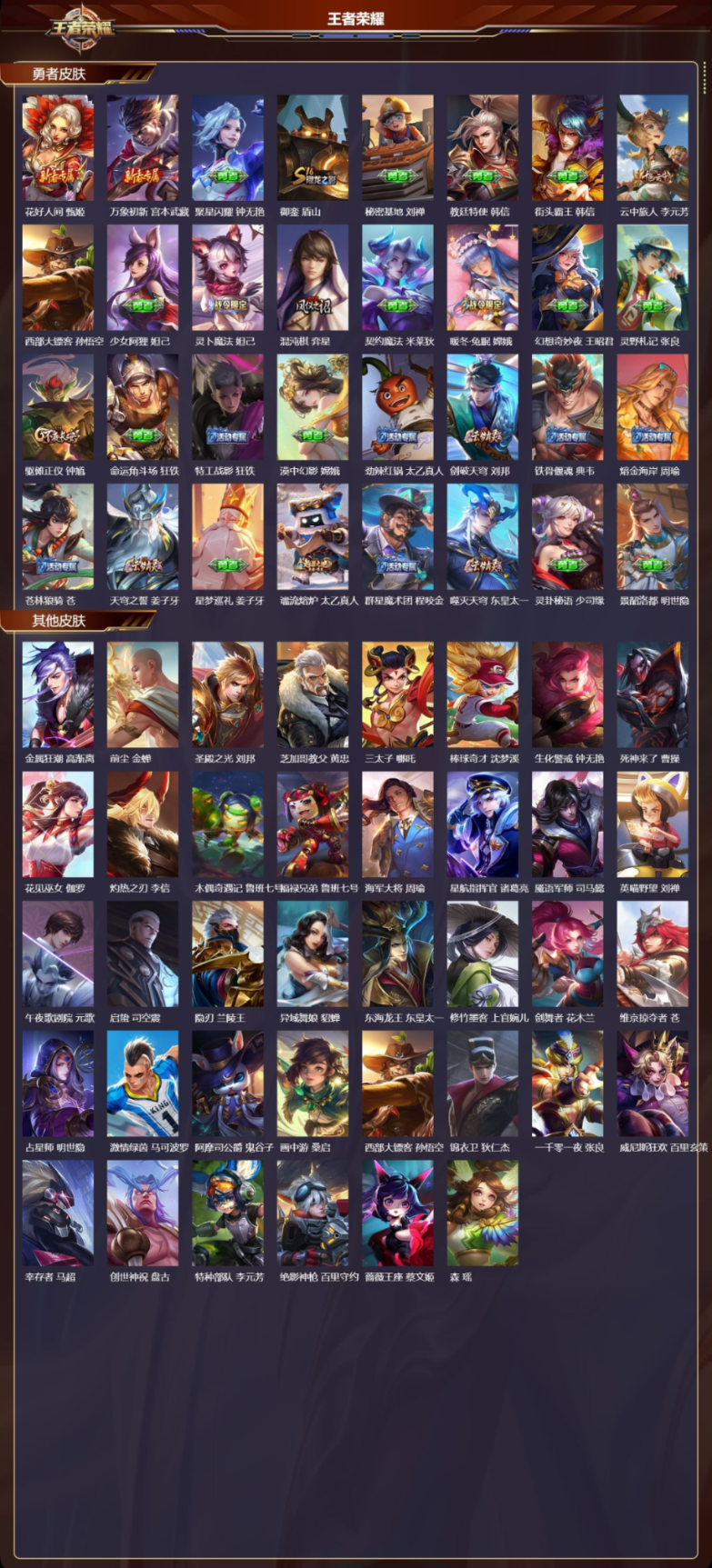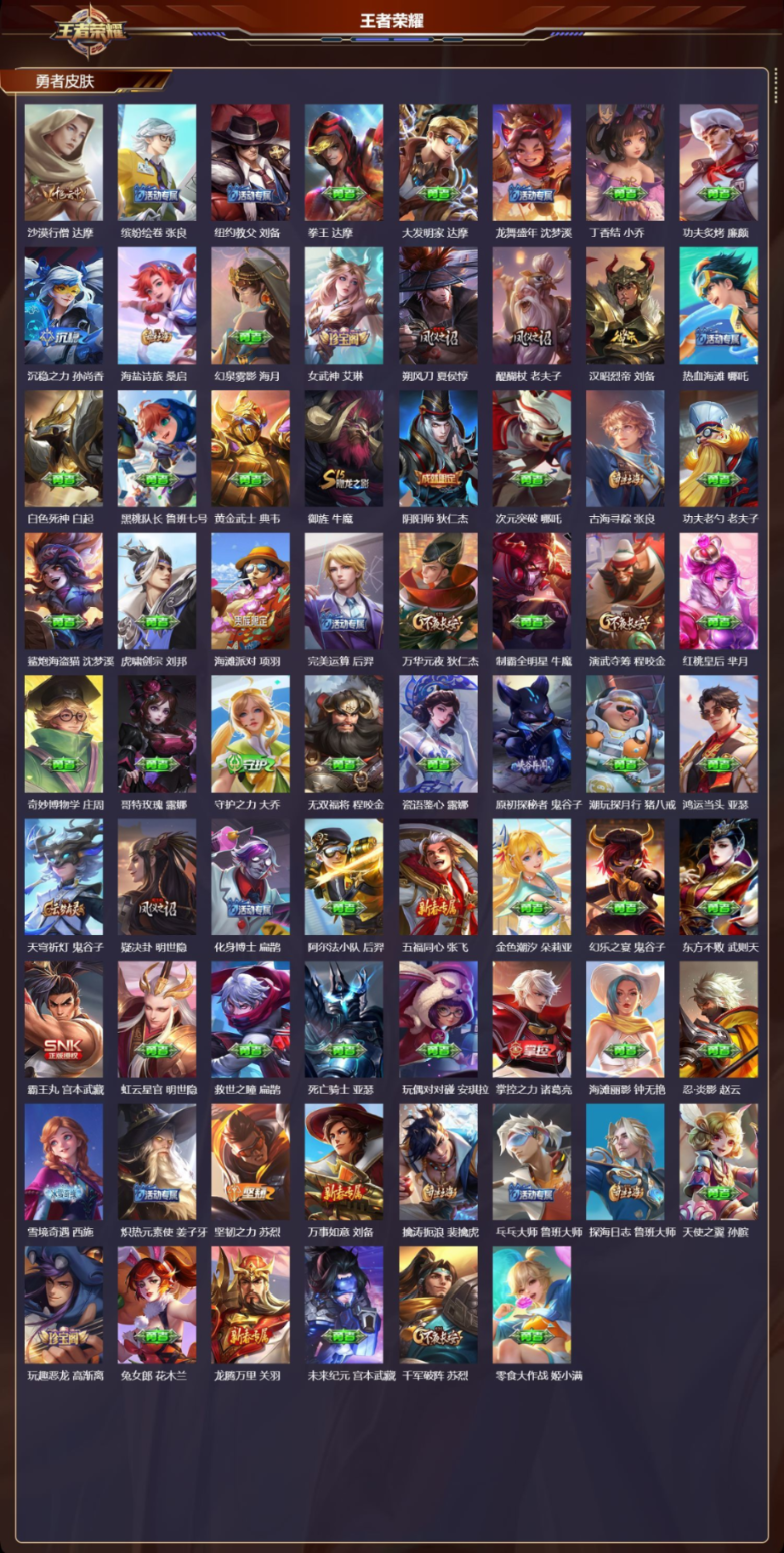 【11 传说皮肤】云霓雀翎 虞姬,诗剑行 李白,仲夏夜之梦 貂蝉,地狱之眼 宫本武藏,黄金射手座 后羿,黄金狮子座 达摩,久胜战神 干将莫邪,末日机甲 孙尚香,黄金白羊座 张良,愿照·九州拓 澜,鸣野蒿 桑启,