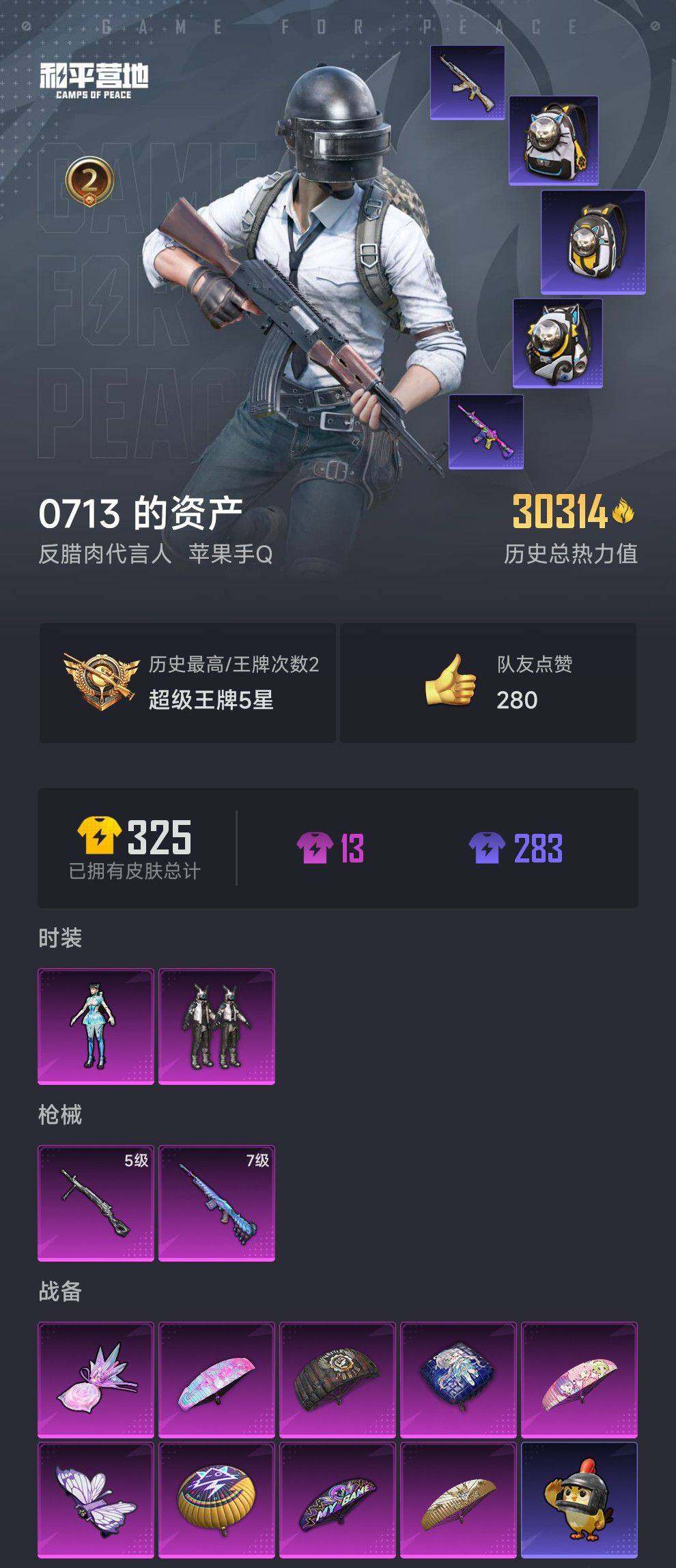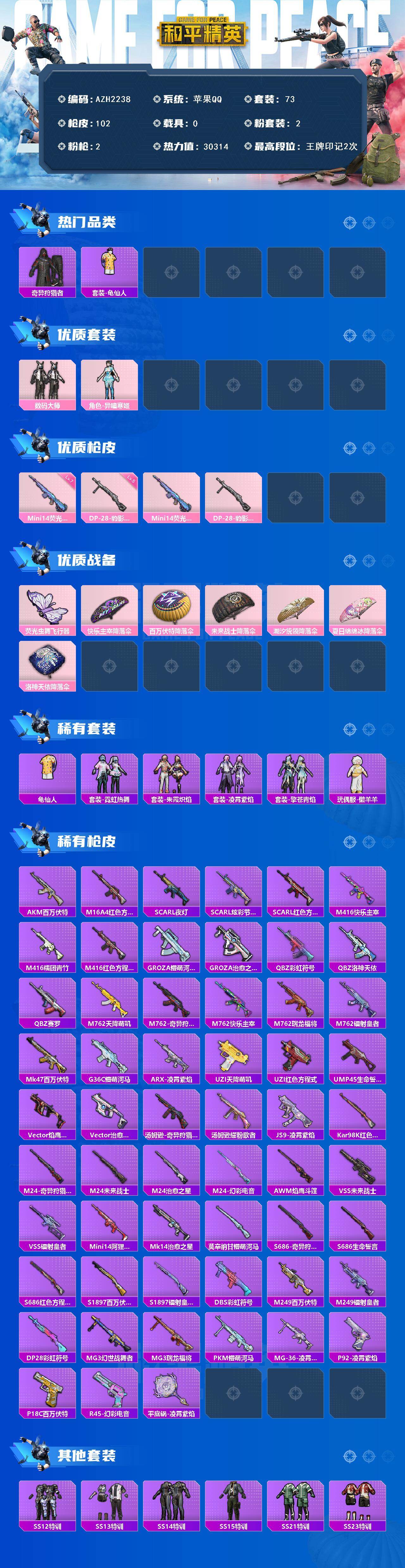 【AZH2238】苹果 手Q【异瞳寒姬 奇异狩猎者 懒羊羊 满级荧光虫舞Mini14 百万伏特背包】2粉装-2特效枪-0载具-2粉色飞行器-30314热力值-2王牌印记-73套装-102枪皮