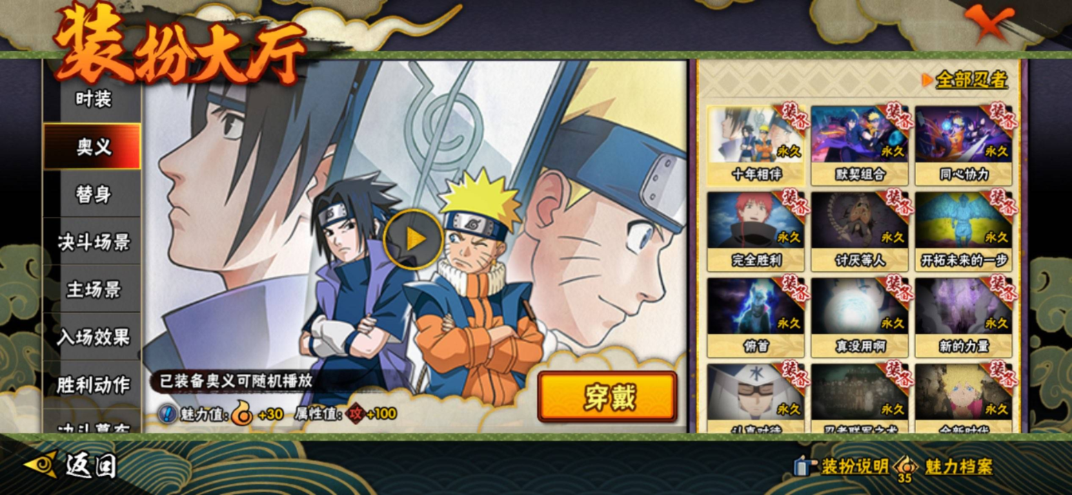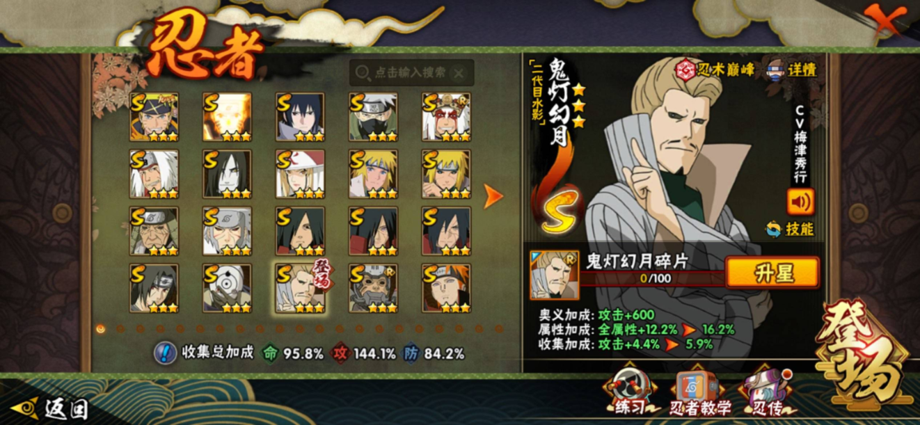 【S级忍者】旗木卡卡西「须佐能乎」(3星),自来也「传说中的三忍」(3星),宇智波斑「秽土转生·解」(3星),宇智波佐助「永恒万花筒」(3星),长门「秽土转生」(3星),漩涡鸣人「九喇嘛连结」(3星),宇智波斑「白面具」(3星),千手扉间「秽土转生」(3星),宇智波斑「秽土转生」(3星),波风水门「秽土转生」(3星),自来也「