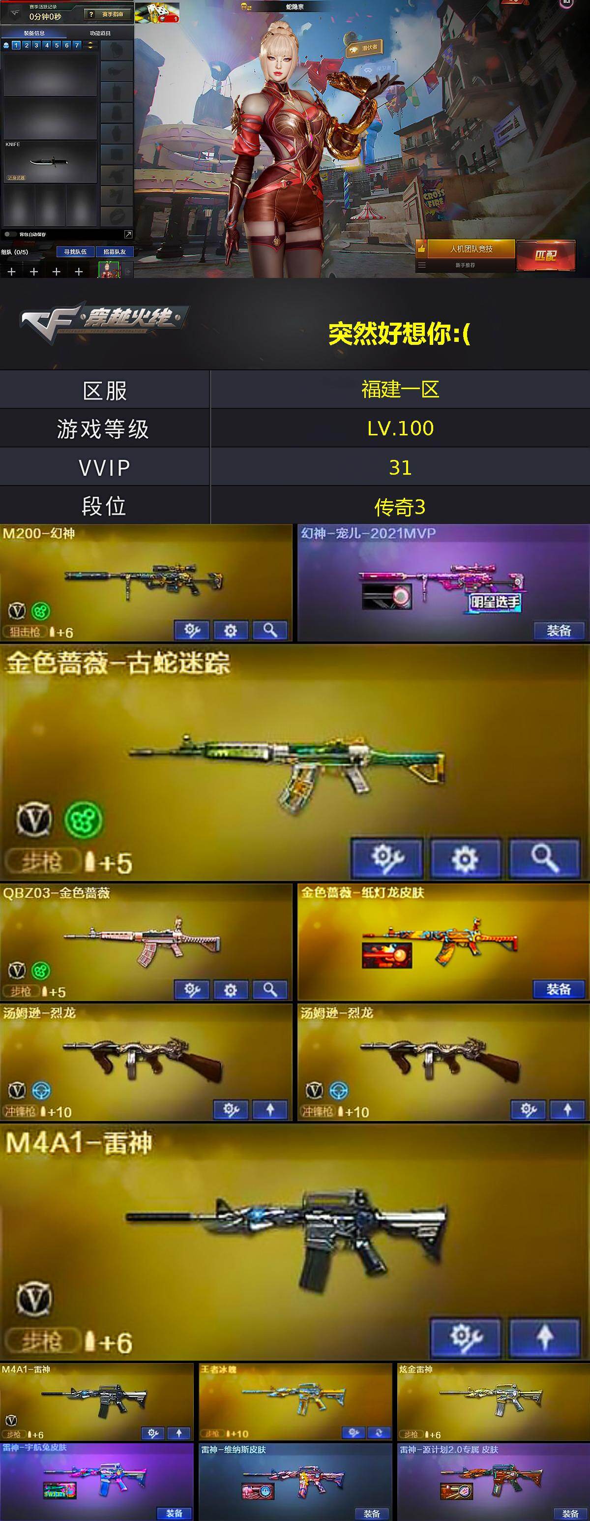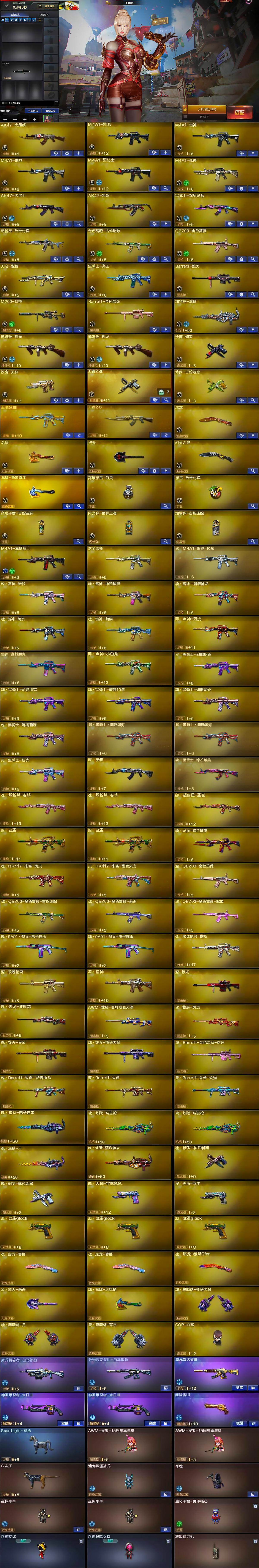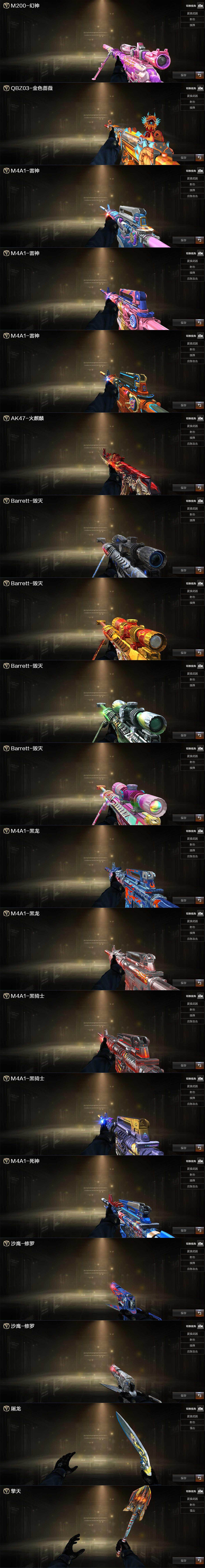 【热门武器】:QBZ03-金色蔷薇,M200-幻神,金色蔷薇-古蛇迷踪,修罗-古蛇迷踪,C.A.T,M4A1-黑骑士,汤姆逊-烈龙*2,加特林-炼狱,COP-白鲨,沙鹰-修罗,金刚伞