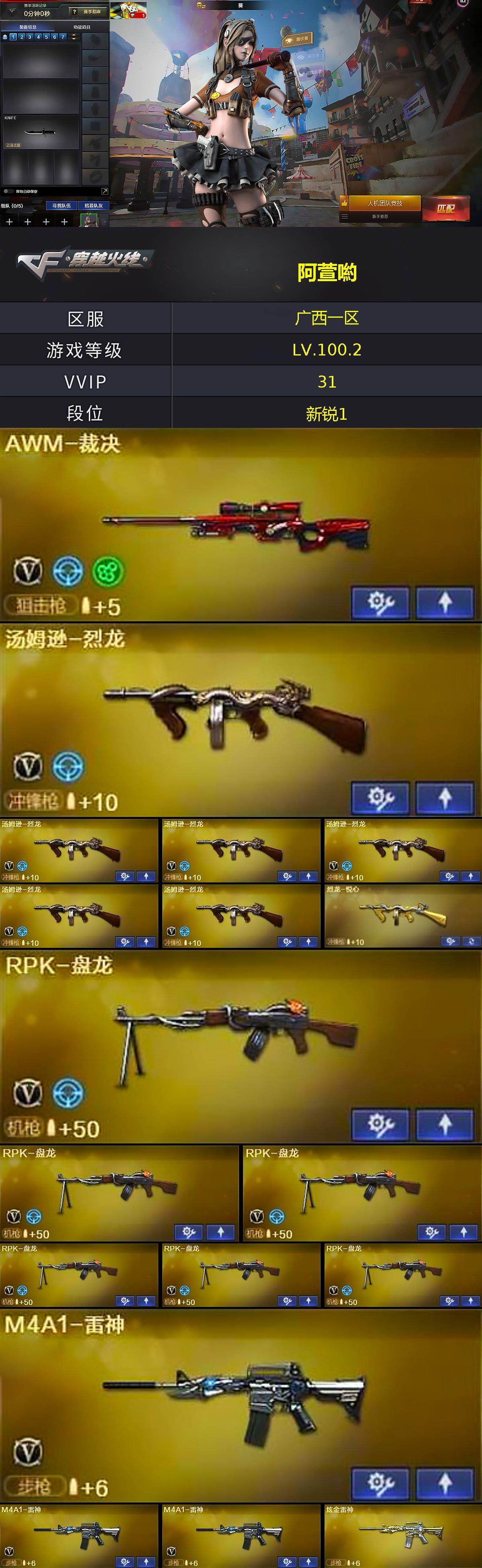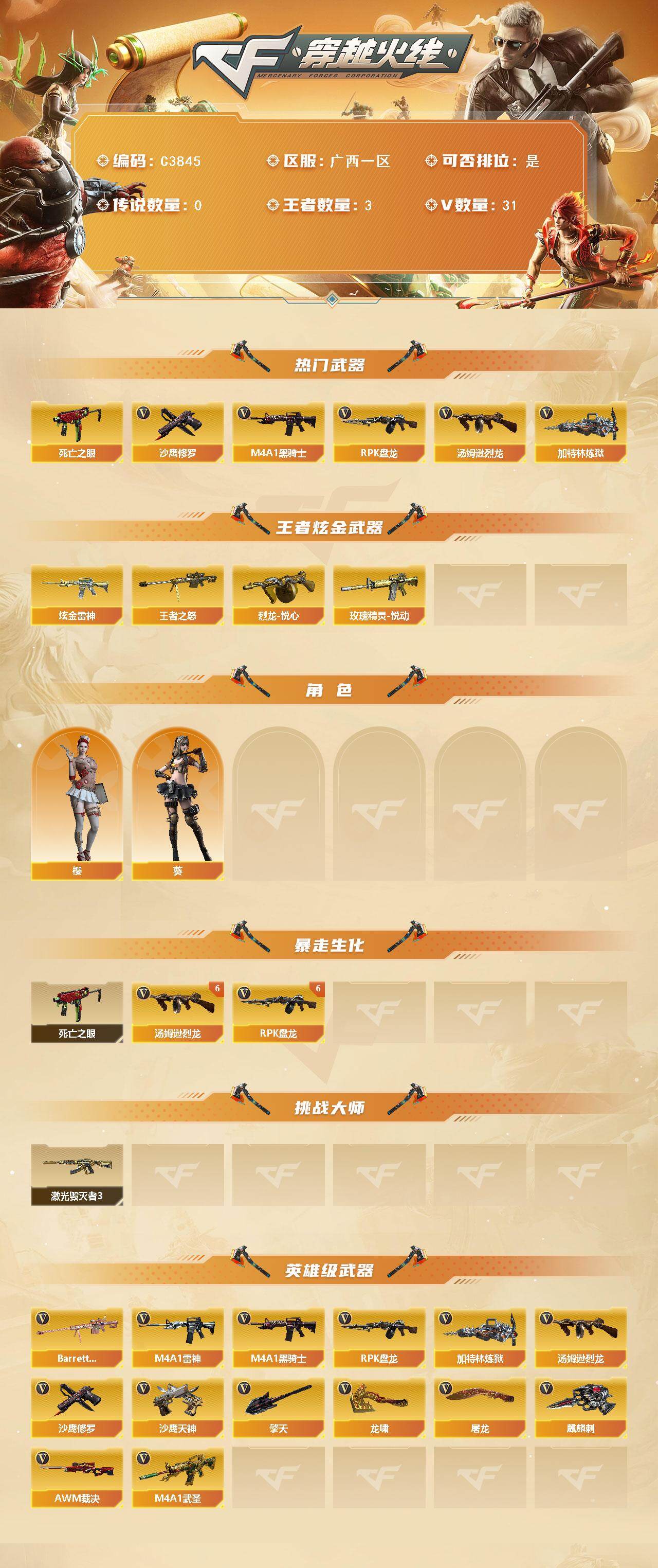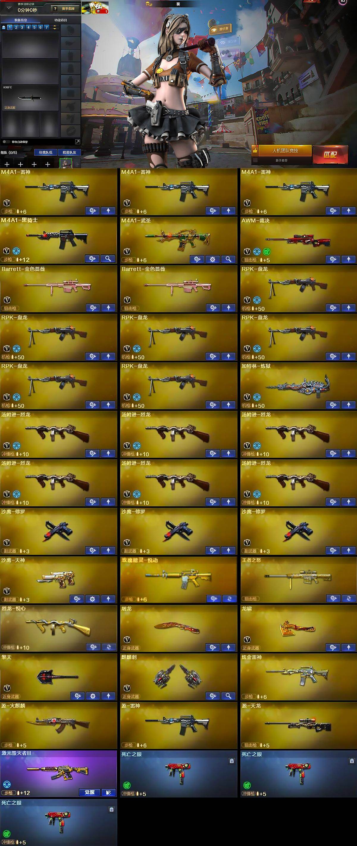 【英雄级武器】:M4A1-雷神*3,M4A1-黑骑士,M4A1-武圣,AWM-裁决,Barrett-金色蔷薇*2,RPK-盘龙*6,加特林-炼狱,汤姆逊-烈龙*6,沙鹰-修罗*3,沙鹰-天神,屠龙
