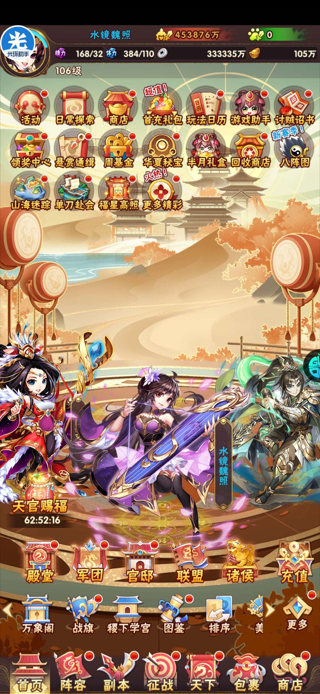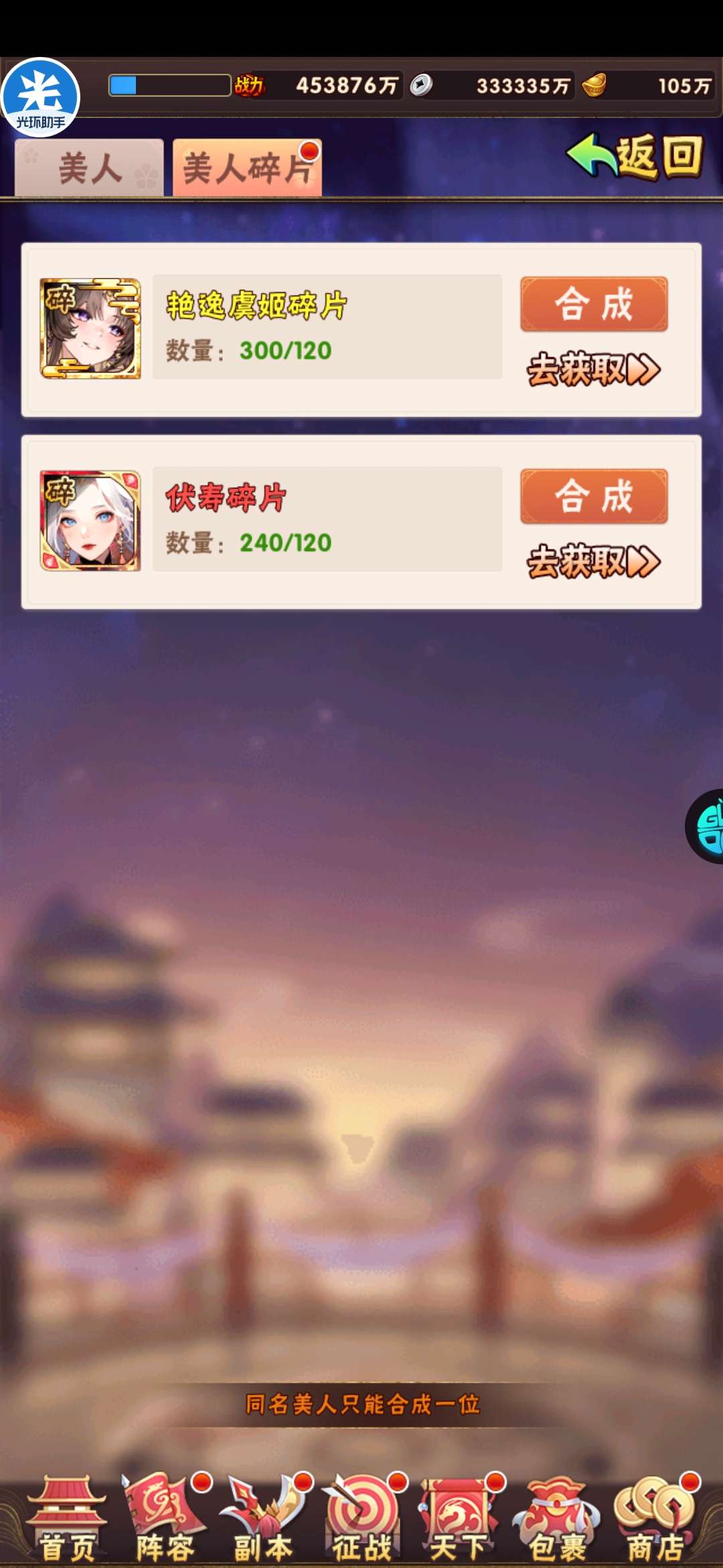 现有元宝105万左右。签到币16万+,每天可换大量基础资源;魂金装备6件套,⌛魂金+昊金兵符,魂金全跟未漏;双丹7万+,刷到150轻松突破!水晶9500+,换翅膀很舒服!⏰魂金:武将、战旗、名将、军师、宠物 、马、神兵、美人全可合成,⏰果盘游戏APP下载少年三国志(五个字的版本)