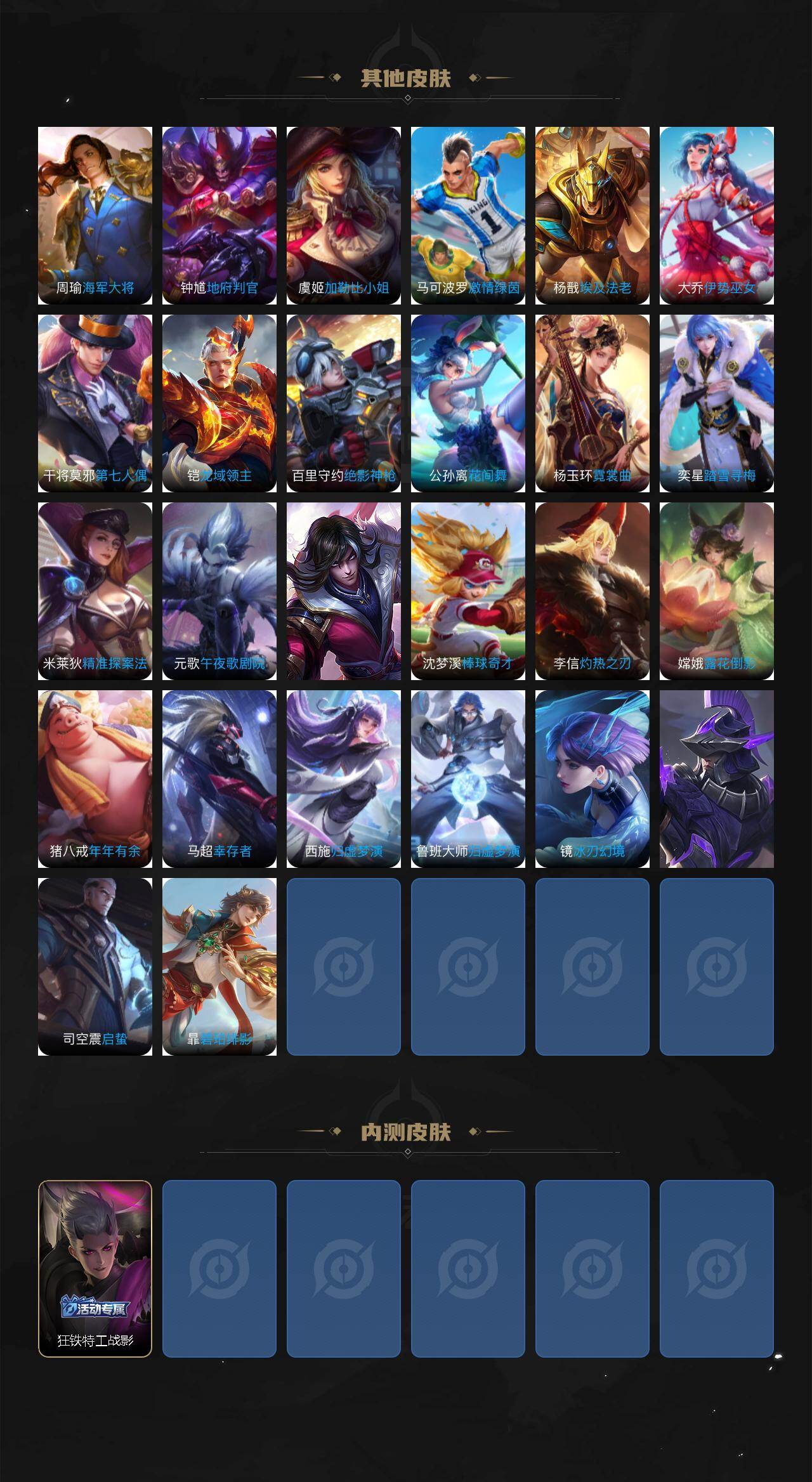 【限定皮肤】:蔡文姬夏日便利店,大乔绒语心约,虞姬夏日便利店,姜子牙天穹之誓,李白谪仙醉月,狄仁杰阴阳师,赵云皇家上将,芈月白晶晶,甄姬游园惊梦,