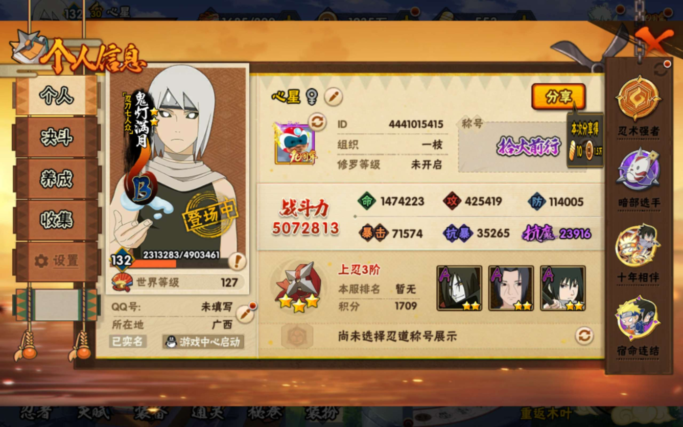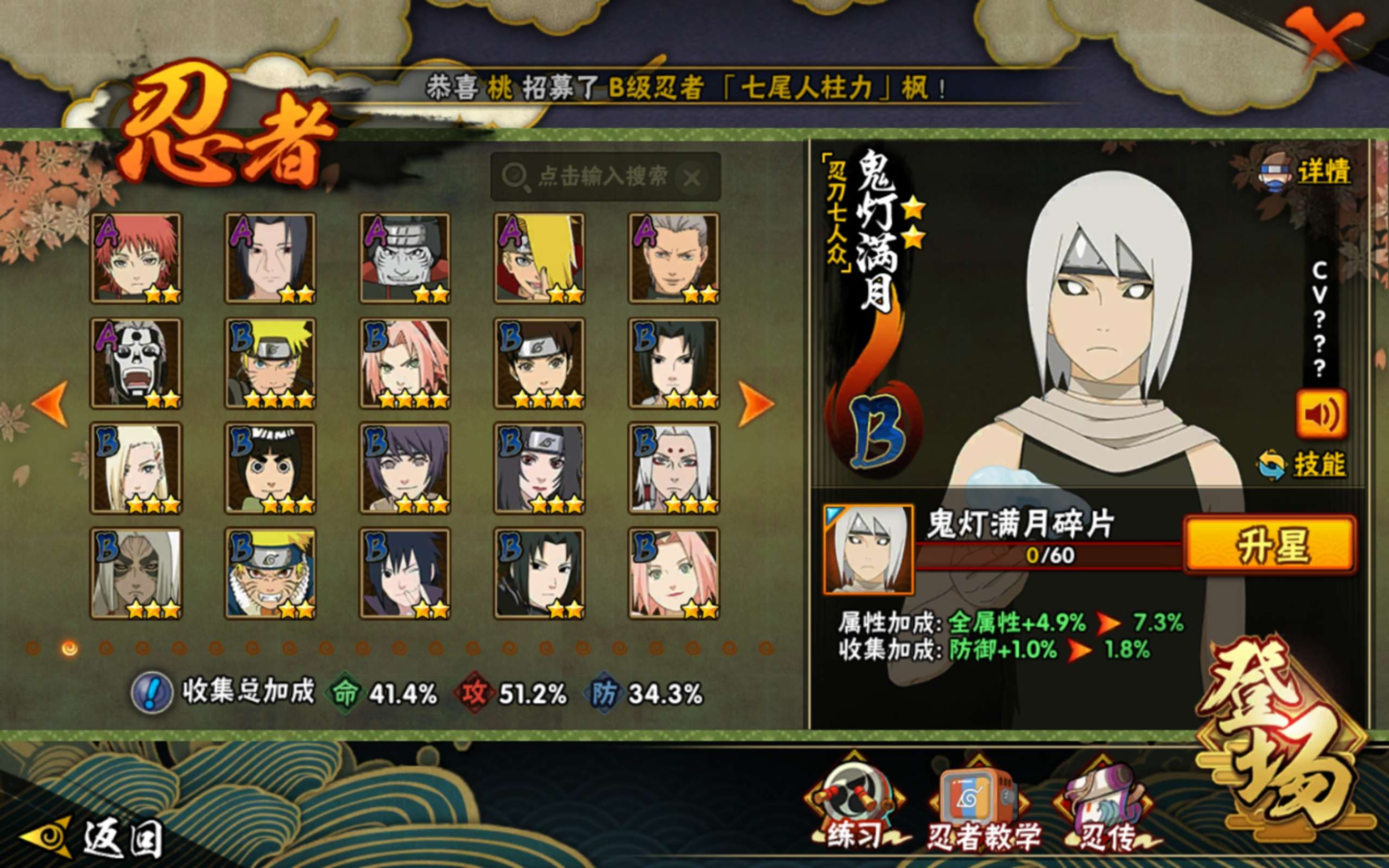 安卓QQ-可二次-S忍者数:7- A忍者数:19 宇智波佐助「须佐能乎」(2星),千代「近松十人卫」(2星),秋道丁次「忍界大战」(2星)