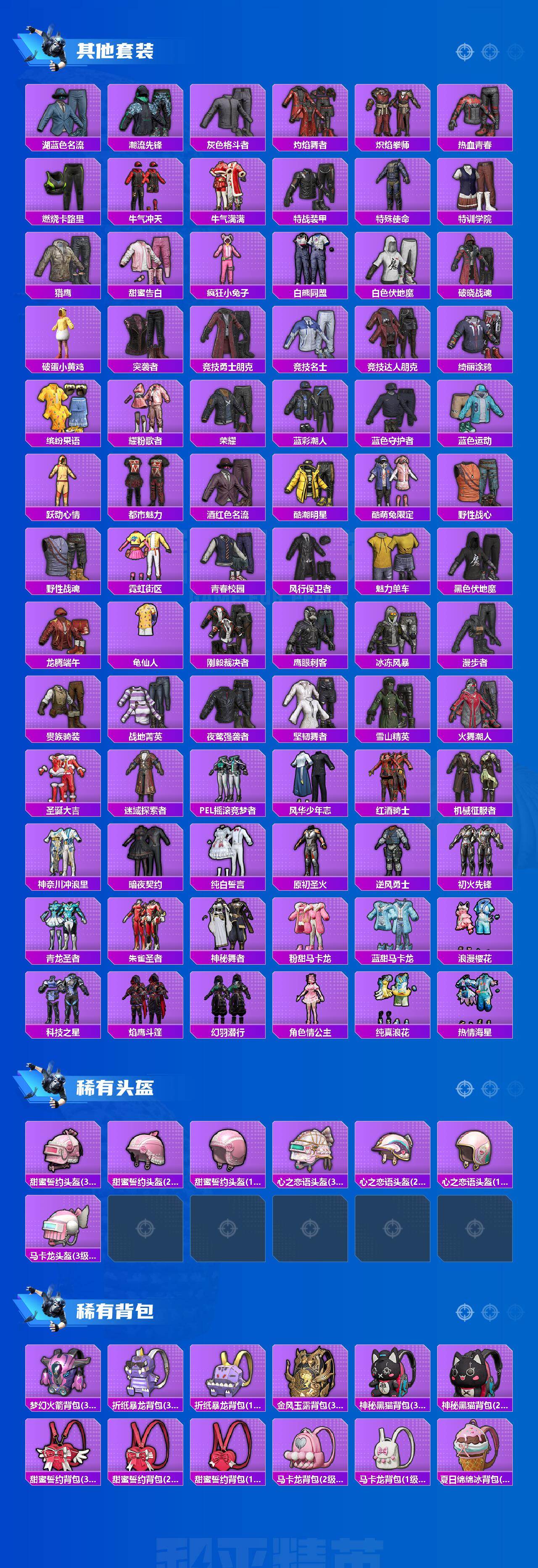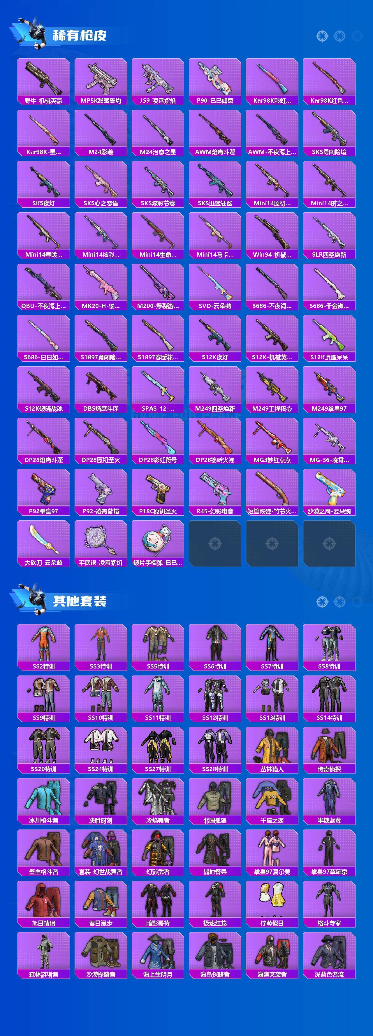 【粉色枪皮等级】:M416-电玩时刻(五级),GROZA-镜光银凌(五级),UMP45-量子极限(五级),Kar98K-巳巳如意(五级),Mk14-甜梦熊击(五级),DP-28-豹影疾电(五级)